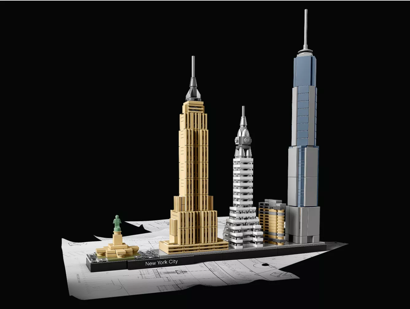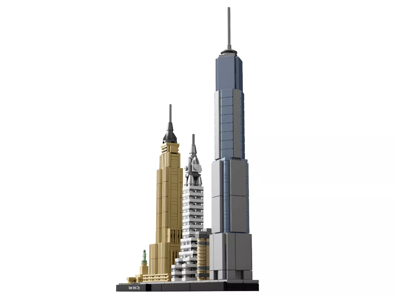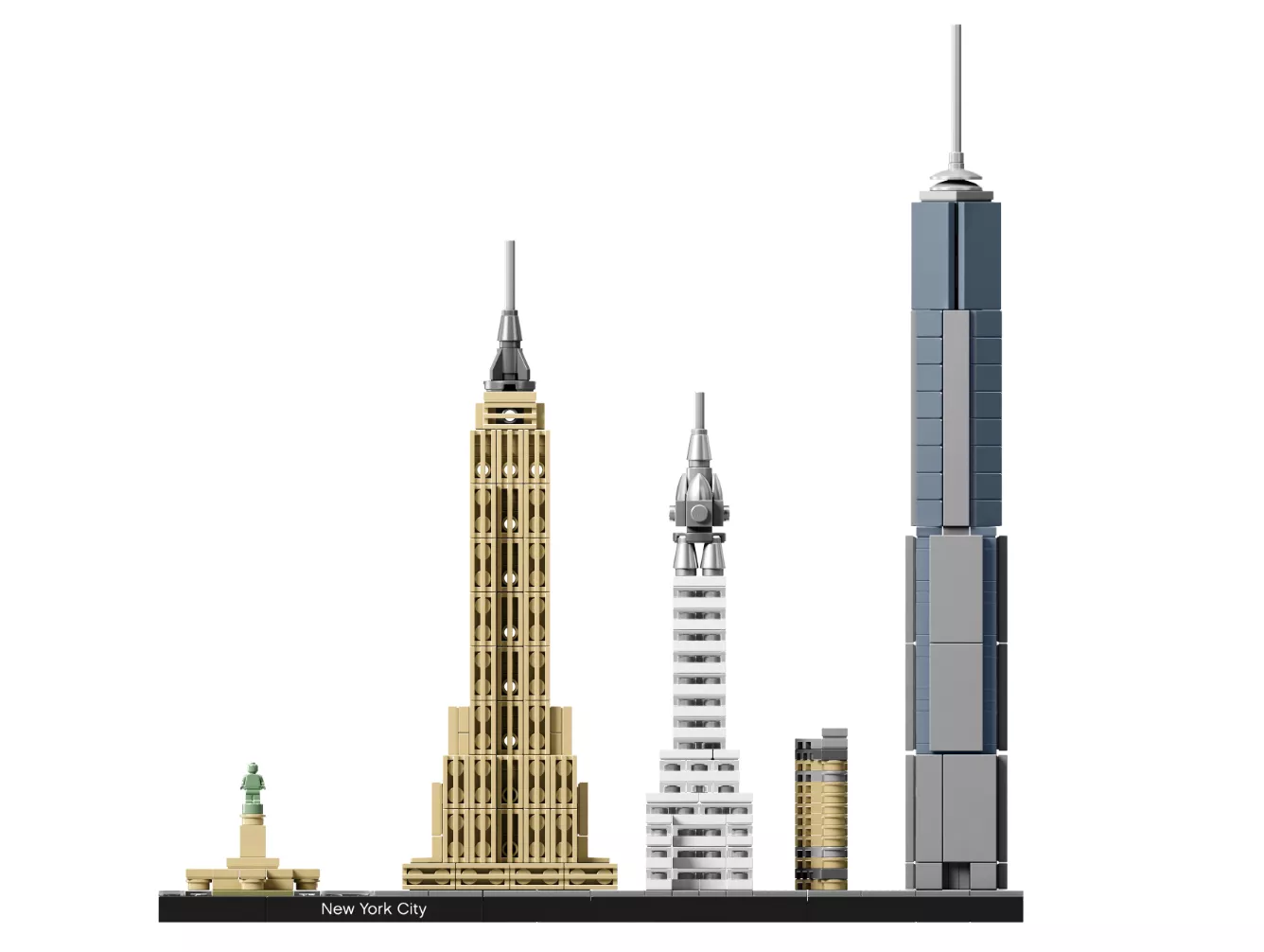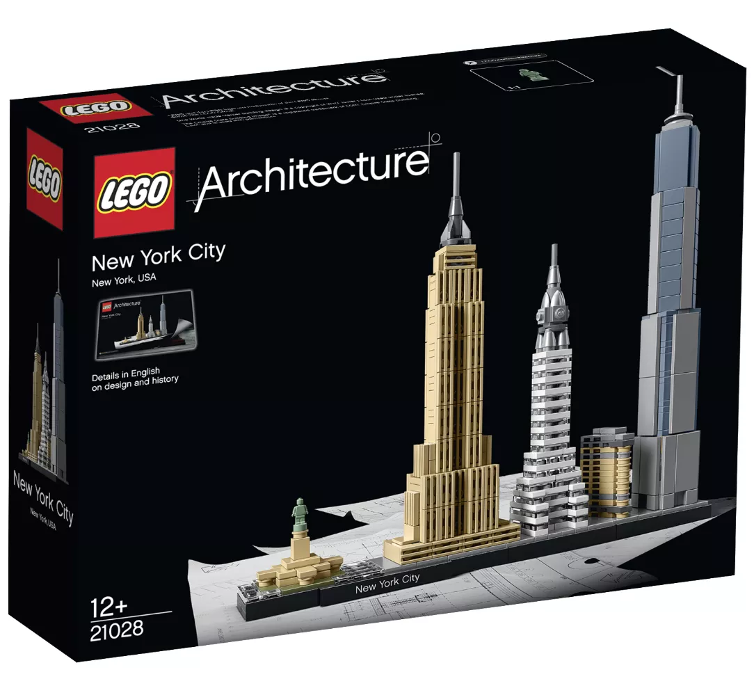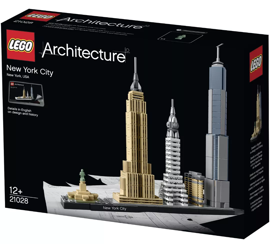 Набор LEGO Architecture 21028 Нью-Йорк «Архитектурный облик Нью-Йорка», разработанный Адамом Ридом Такером, включает пять знаковых сооружений Нью-Йорка: Статую Свободы, Эмпайр-стейт-билдинг, Крайслер-билдинг, Флэтайрон-билдинг и «Башню Свободы» Всемирного торгового центра. Здания расположены на узком основании глубиной в четыре кубика. Набор, состоящий почти из 600 деталей и имеющий рекомендованную розничную цену 59,99 долларов, является средним по размеру в серии LEGO Architecture и предлагает различные сложные строительные приемы, особенно для модели Башни Свободы. В наборе есть несколько отличных деталей, но недостаток разнообразия компенсируется количеством некоторых из них.
