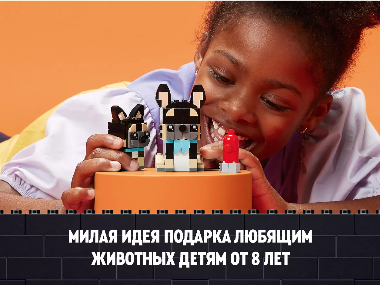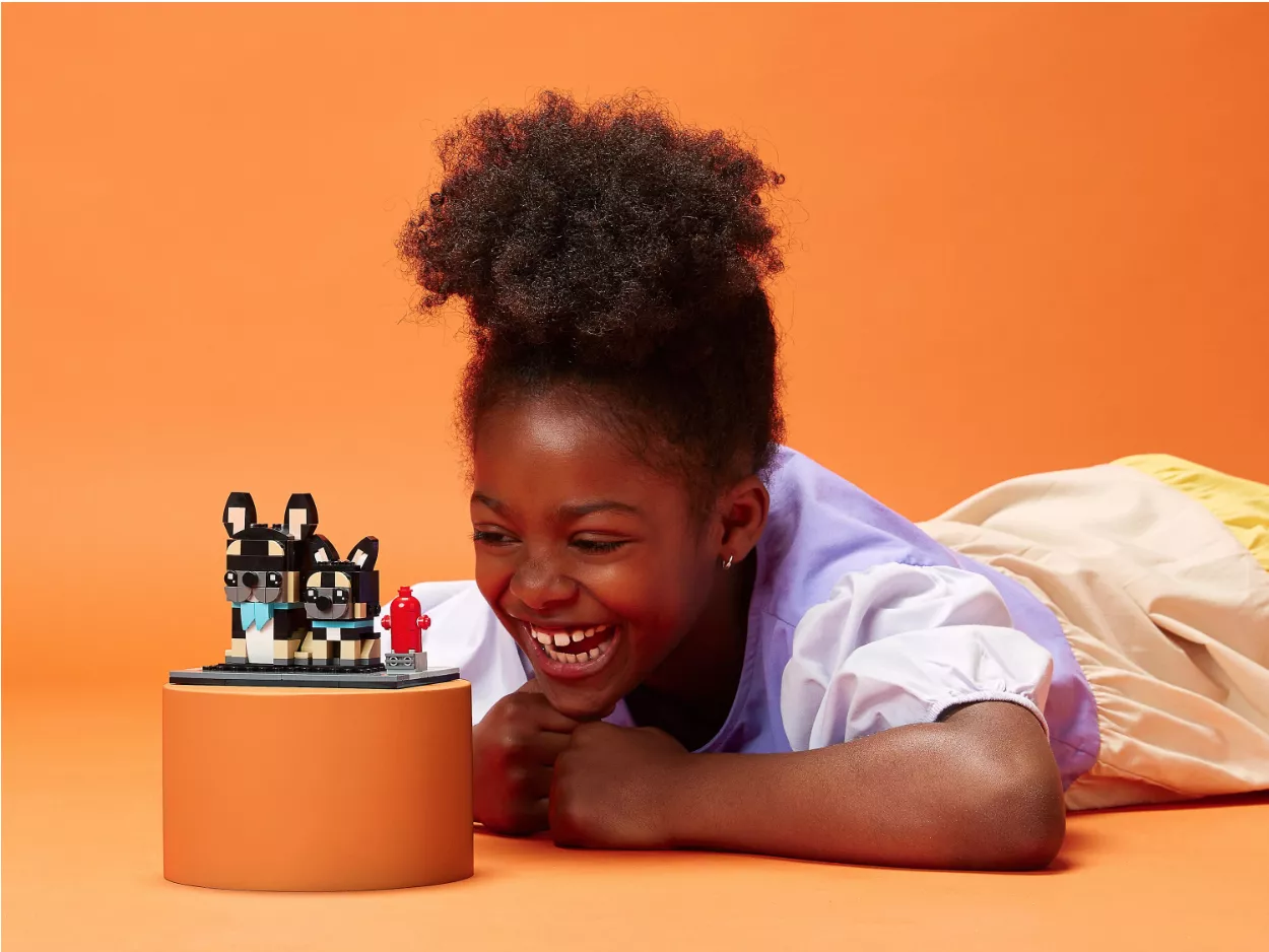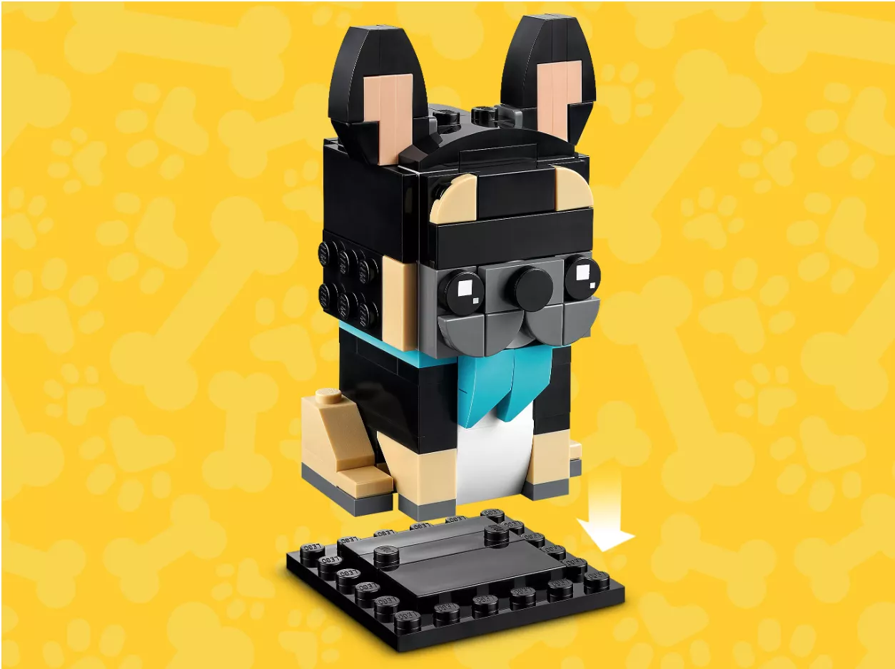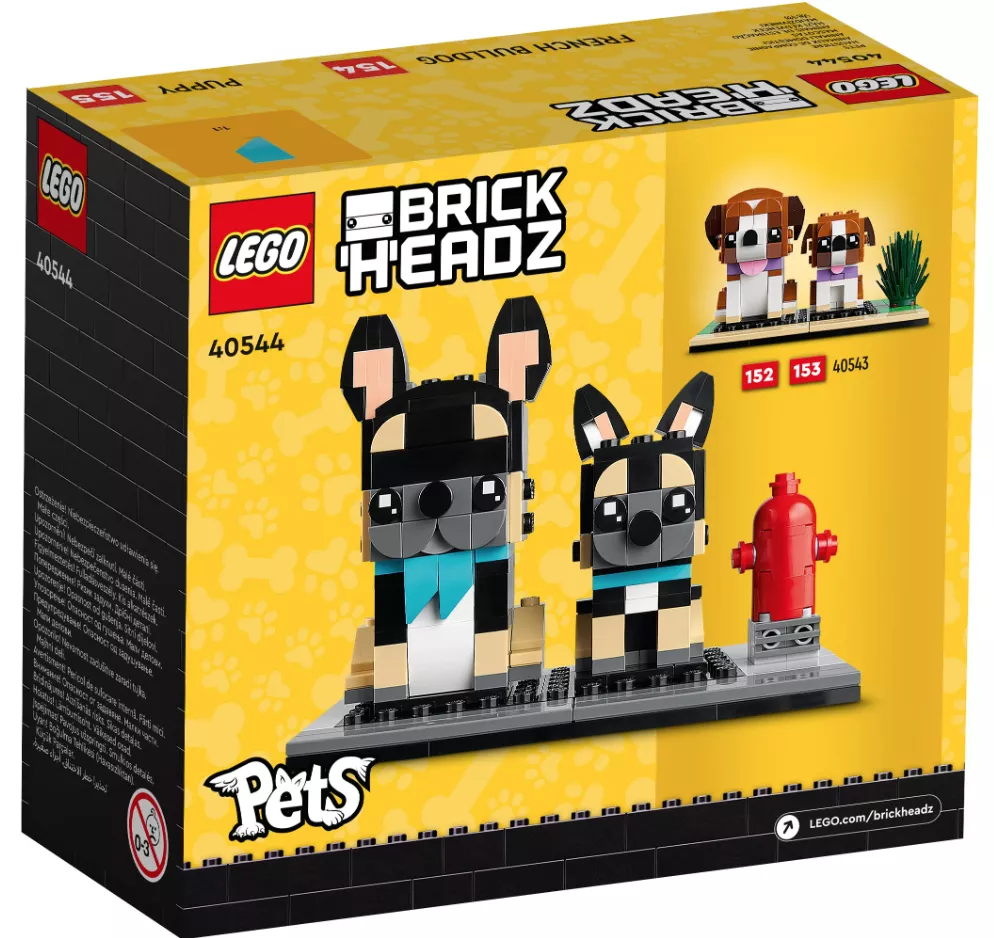 Набор LEGO 40544 «Французский бульдог» из серии BrickHeadz Pets, выпущенный в 2022 году, содержит 237 деталей. В него можно собрать взрослого французского бульдога и щенка, обозначенных номерами BrickHeadz 154 и 155. Модели украшены синими шарфами и подставками, а также небольшим сборным красным пожарным гидрантом.