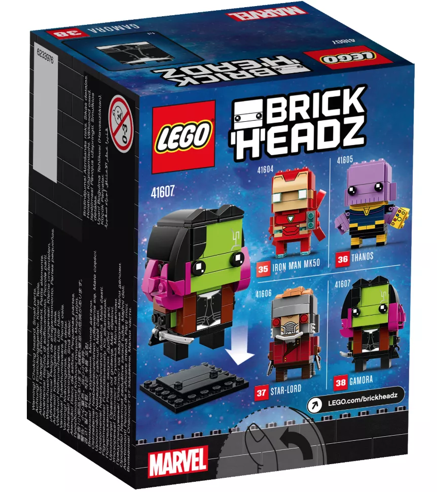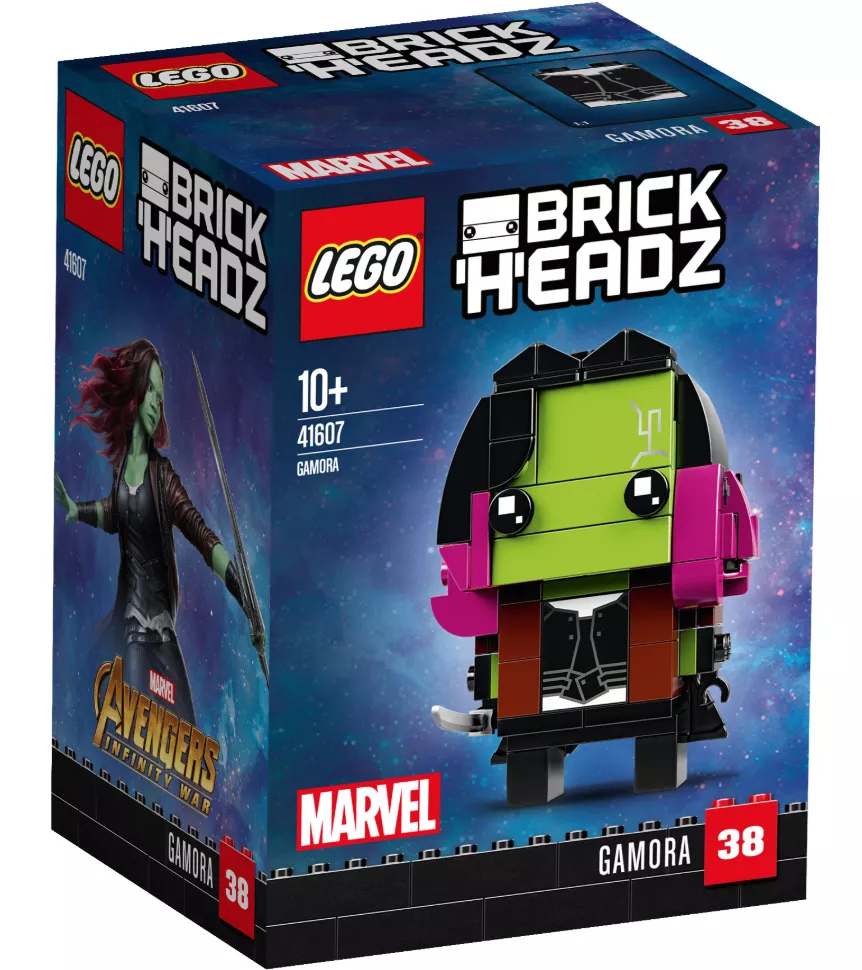 Набор LEGO 41607 Гамора — это набор Brickheadz из 136 деталей, выпущенный в 2018 году. В него входит сборная фигурка Гаморы с зелёной кожей, тёмно-розовыми прядями в волосах и чёрным костюмом из фильма «Мстители: Война бесконечности».