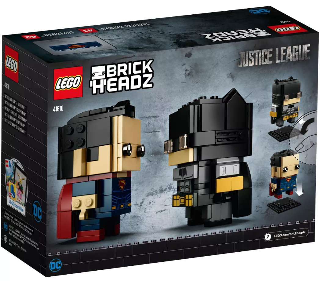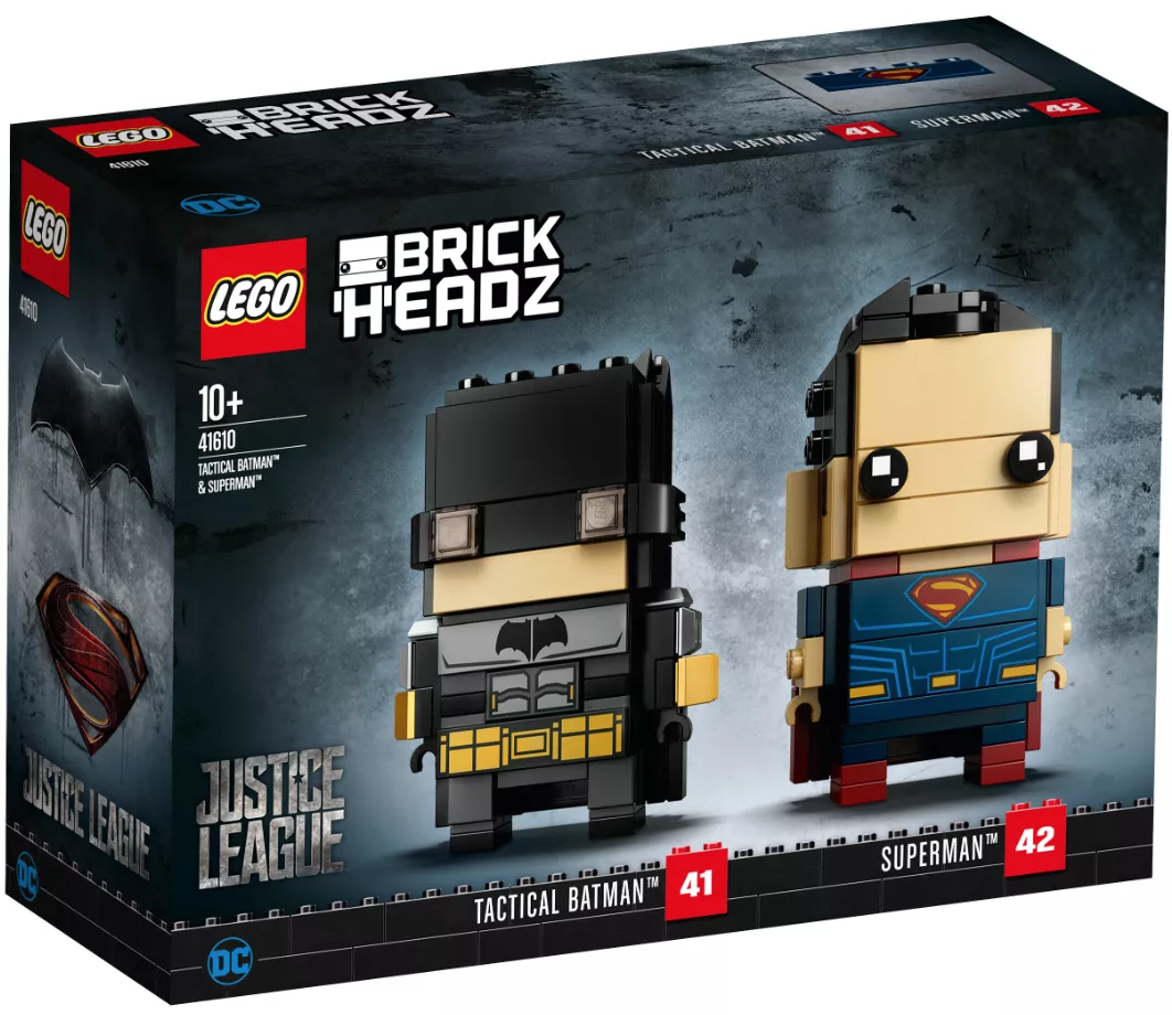 Набор LEGO 41610 «Тактический Бэтмен и Супермен» от BrickHeadz, состоящий из 209 деталей, был выпущен в 2018 году. В него входят сборные фигурки LEGO BrickHeadz «Тактический Бэтмен» и «Супермен» в костюмах и плащах супергероев.