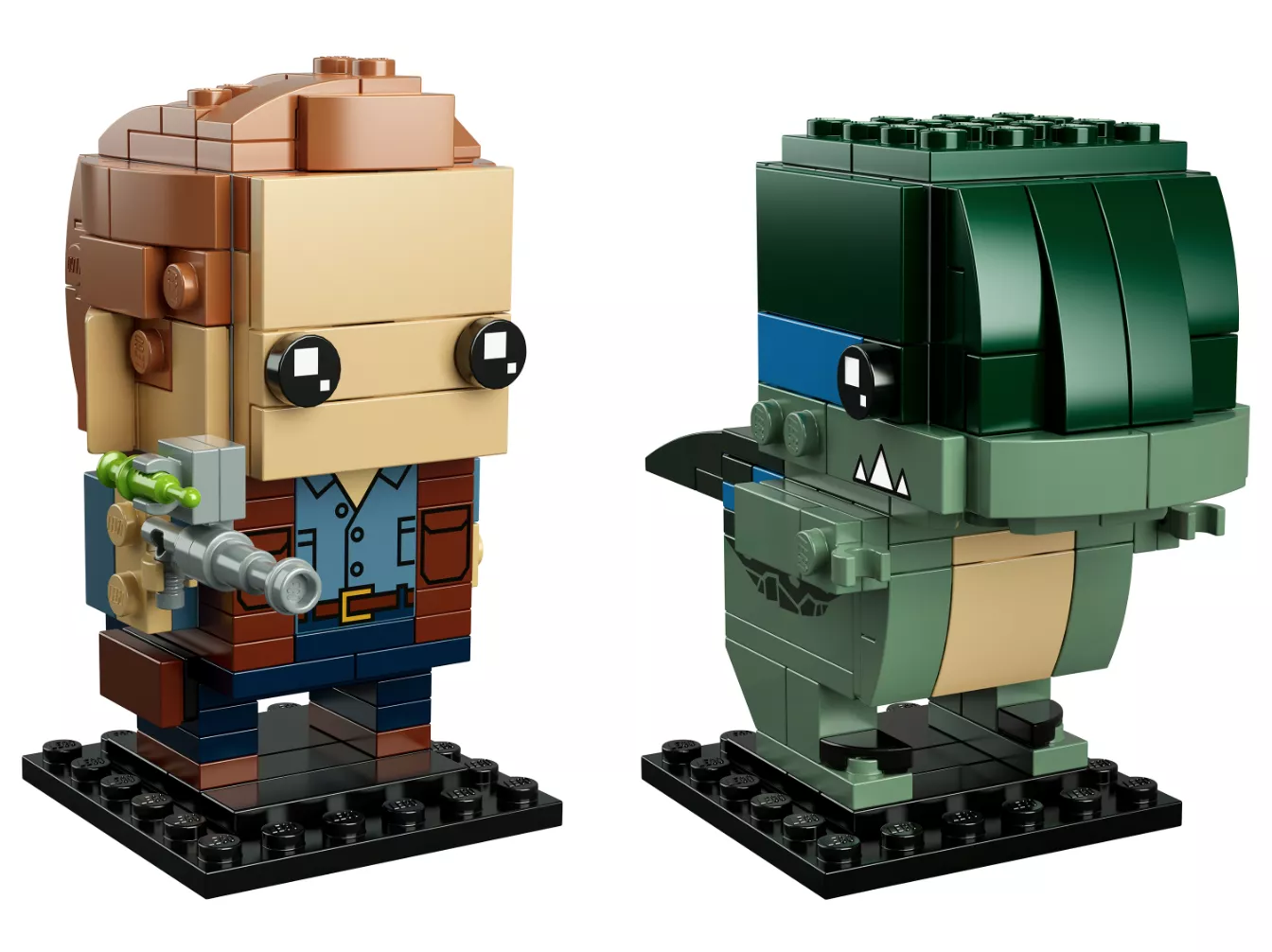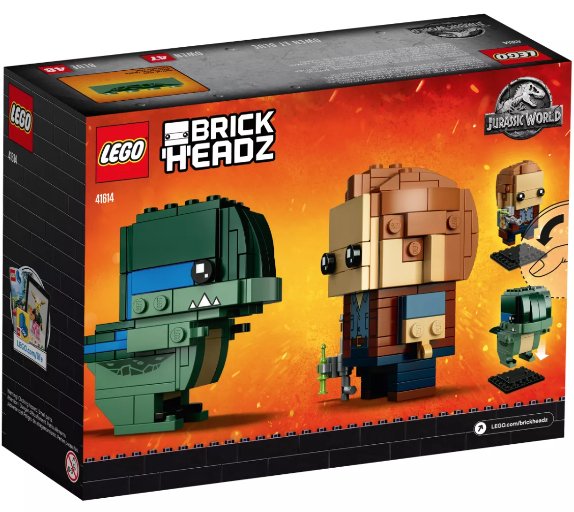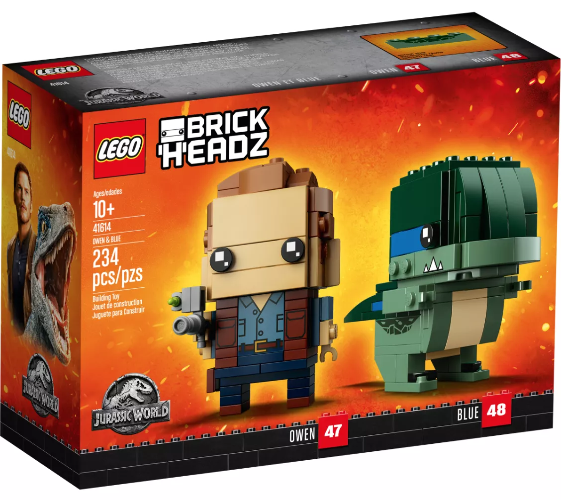 Набор LEGO 41614 «Оуэн и Блю» от BrickHeadz, состоящий из 234 деталей, был выпущен в 2018 году. Он включает в себя фигурки дрессировщика динозавров с транквилизатором и велоцираптора с характерными зубами.