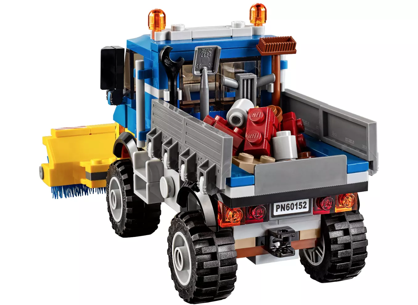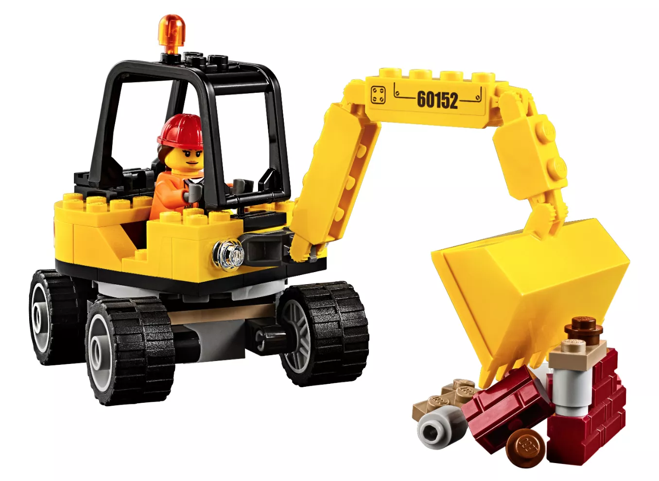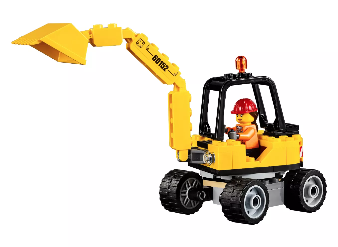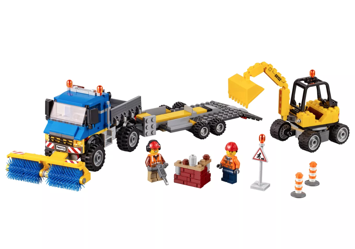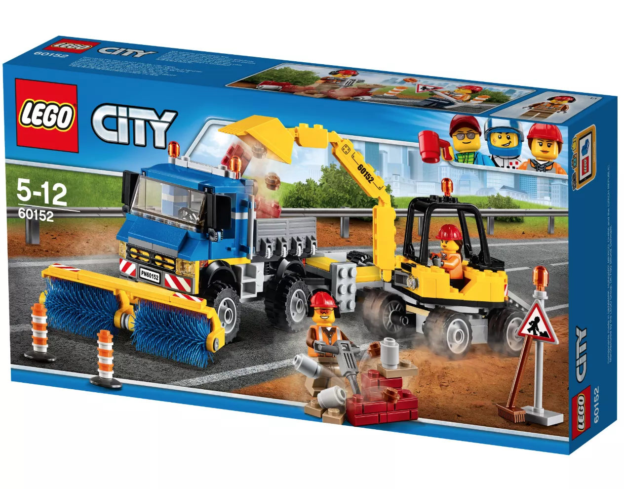Набор LEGO 60152 «Подметальная машина и экскаватор» — это городской набор из 299 деталей с 2 минифигурками, выпущенный в 2017 году. В него входят грузовик с вращающимися щетками, съемный прицеп, экскаватор с подвижной стрелой и ковшом, вращающийся корпус, дорожный знак, конусы, элементы кирпичной стены, различные инструменты и две минифигурки городских рабочих.