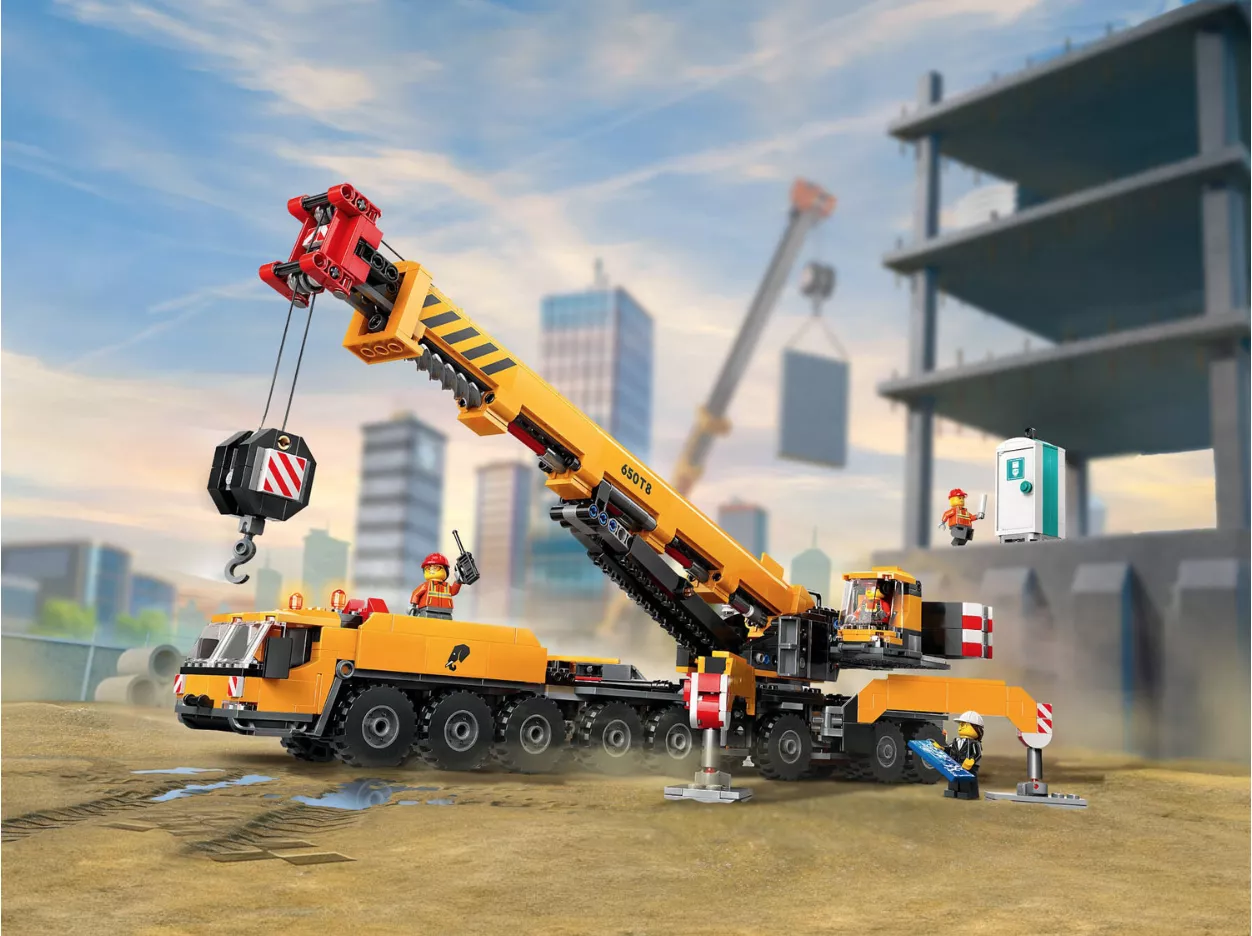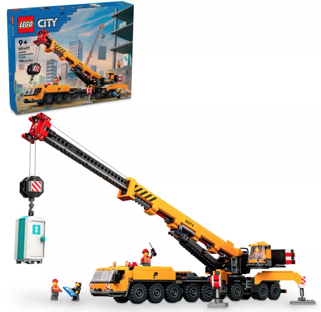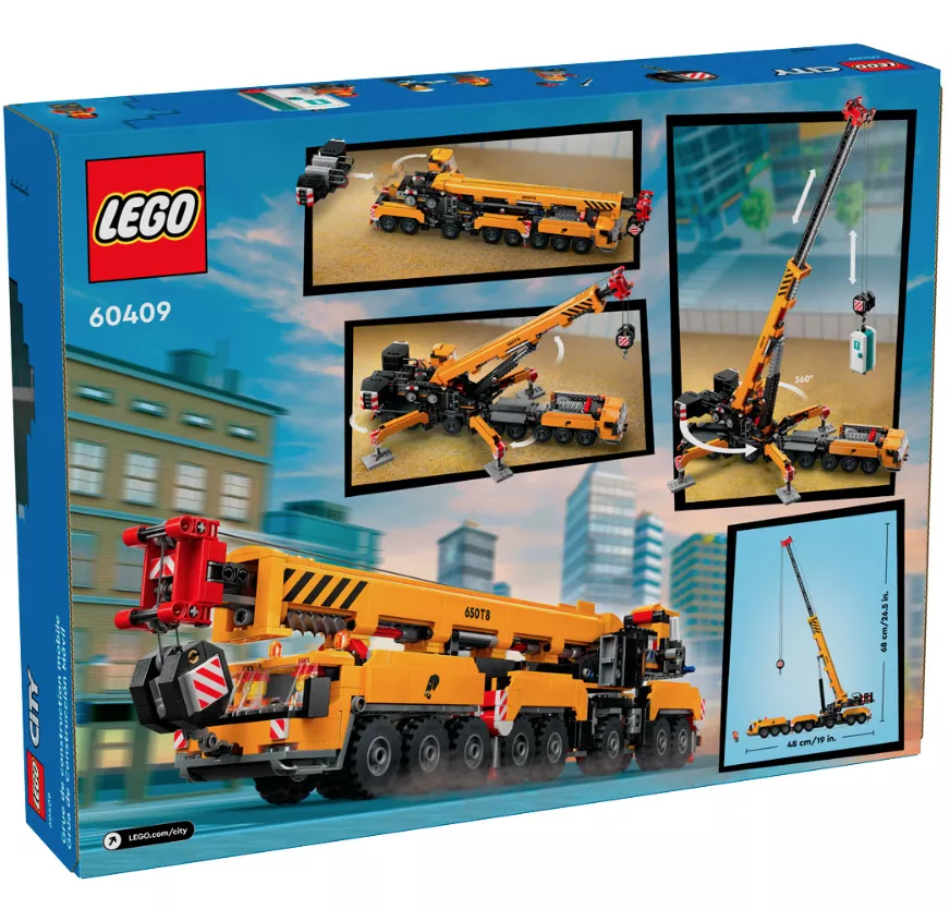 Набор LEGO 60409 «Передвижной строительный кран» — это городской набор из 1116 деталей с 4 минифигурками, выпущенный в 2024 году. В него входит желтый передвижной строительный кран со складными опорными ножками, поворотной кабиной, выдвижной и вращающейся на 360 градусов стрелой и функциональным подъемником, а также 4 минифигурки рабочих.