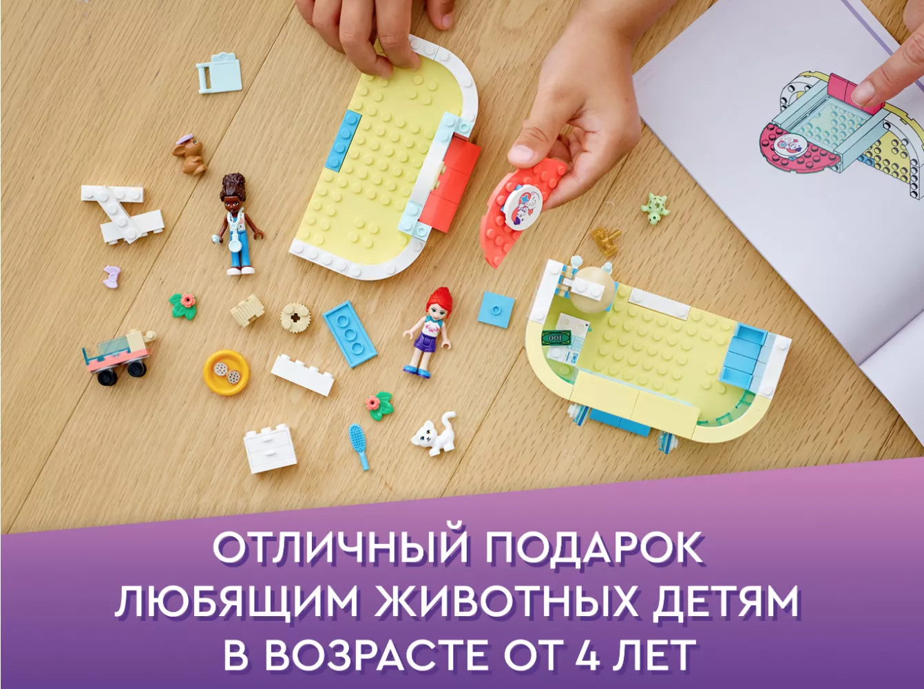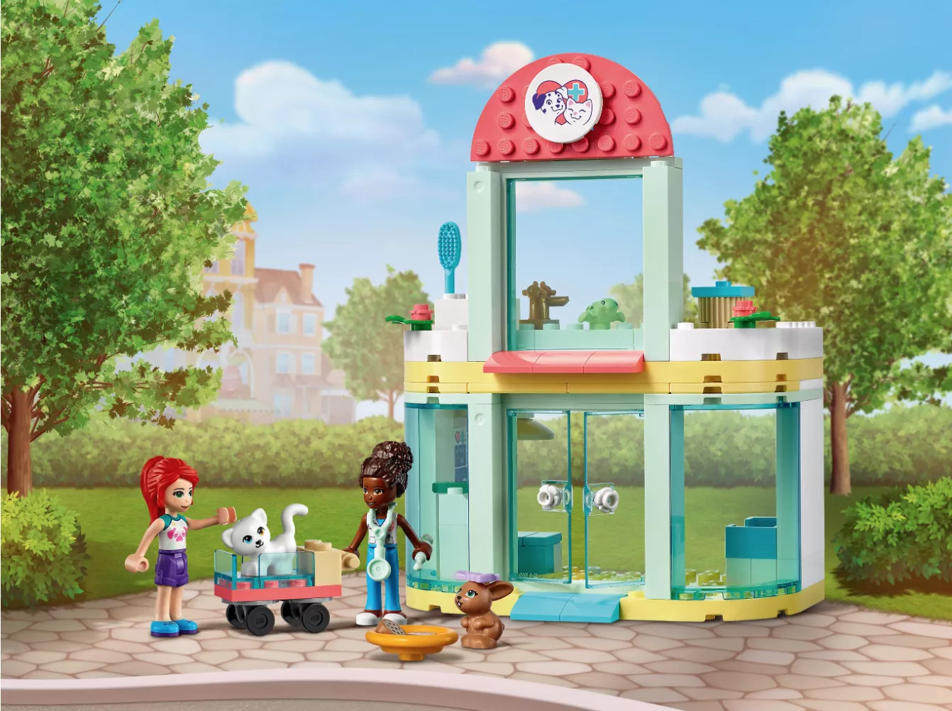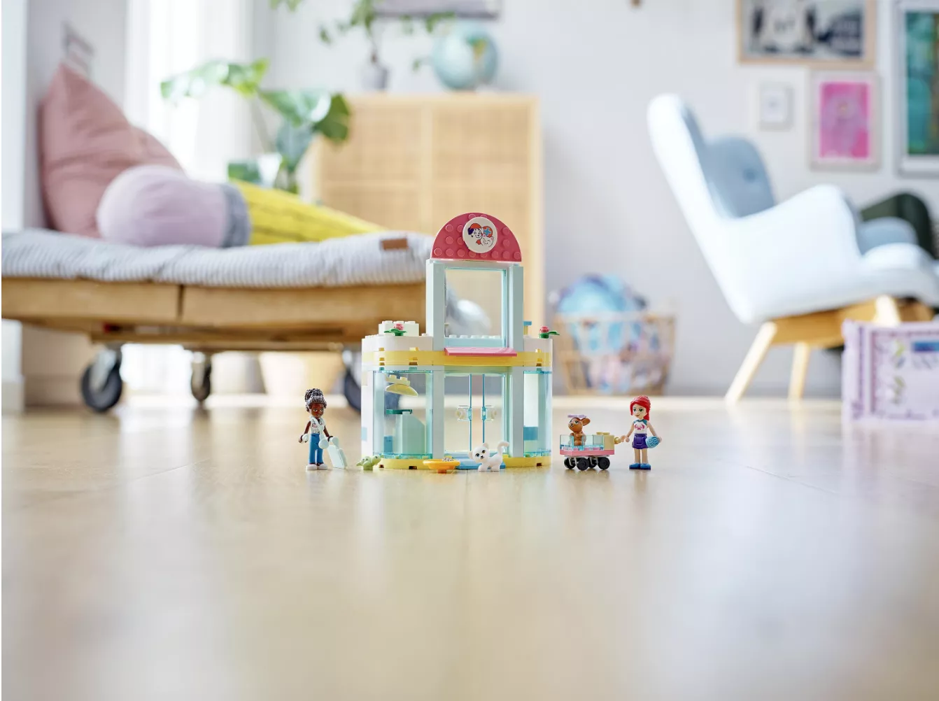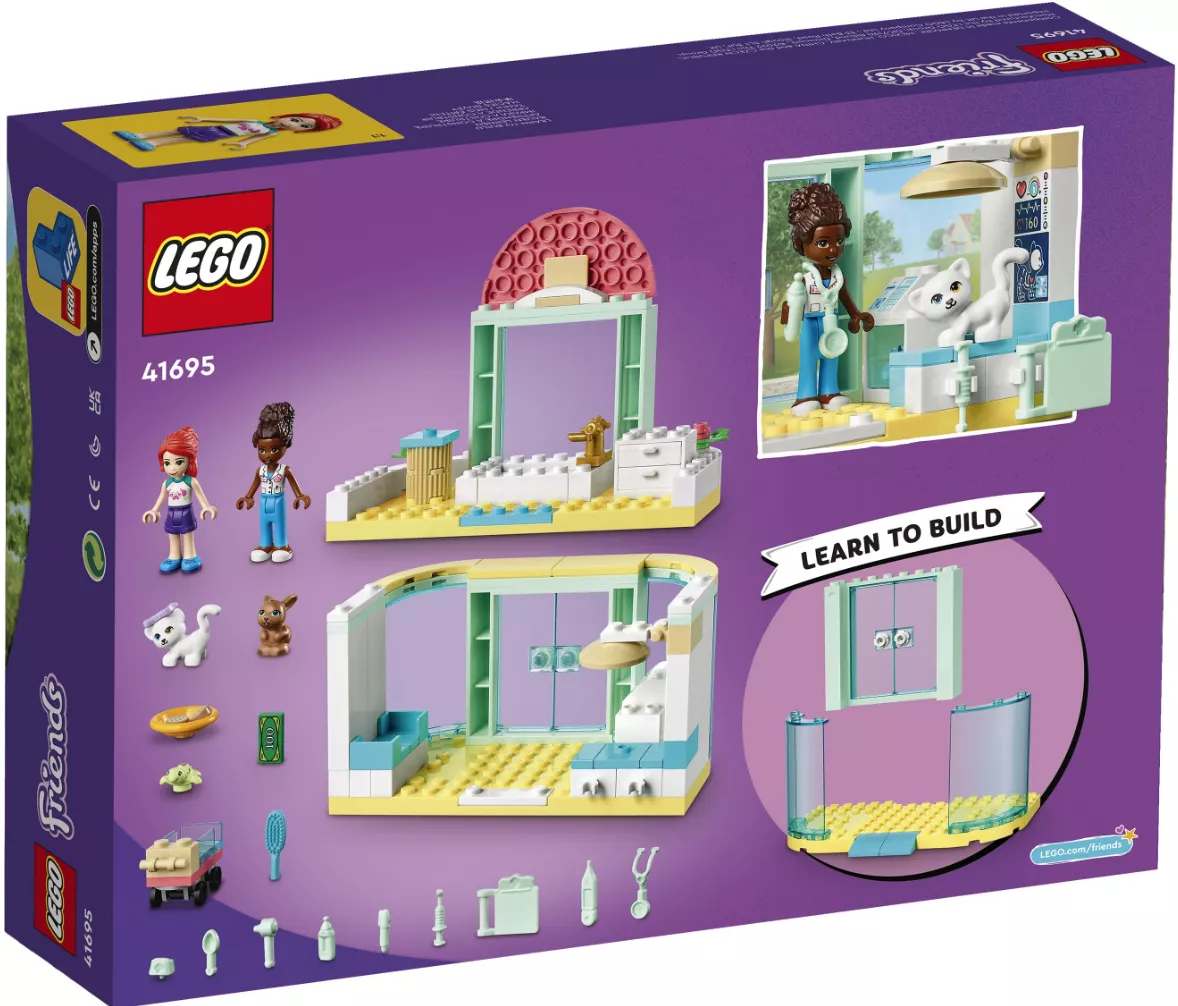 Конструктор LEGO Friends 41695 Клиника для домашних животных из серии «Друзья» (Хартлейк-Сити), выпущенный в 2022 году, содержит 111 деталей и 2 мини-фигурки. Предназначен для детей от 4 лет и включает в себя фигурки Мии, а также фигурки кошек, черепах и кроликов. Клиника оснащена игрушечным сканером, зоной для груминга и когтеточкой, а съемный верхний этаж обеспечивает доступ к деталям нижнего этажа, таким как кассовый аппарат и шкаф с инструментами. Пакеты с деталями набора организованы таким образом, чтобы в каждом находился персонаж или животное и небольшая модель.