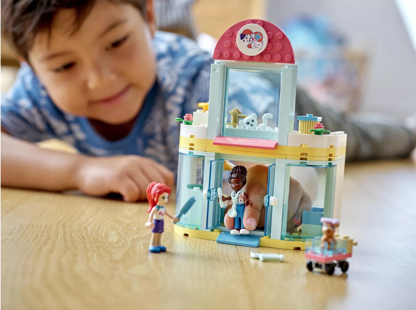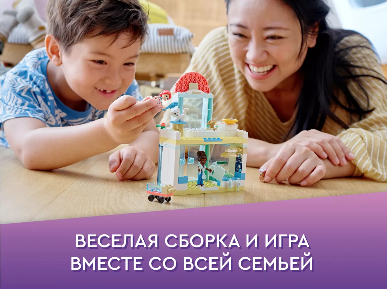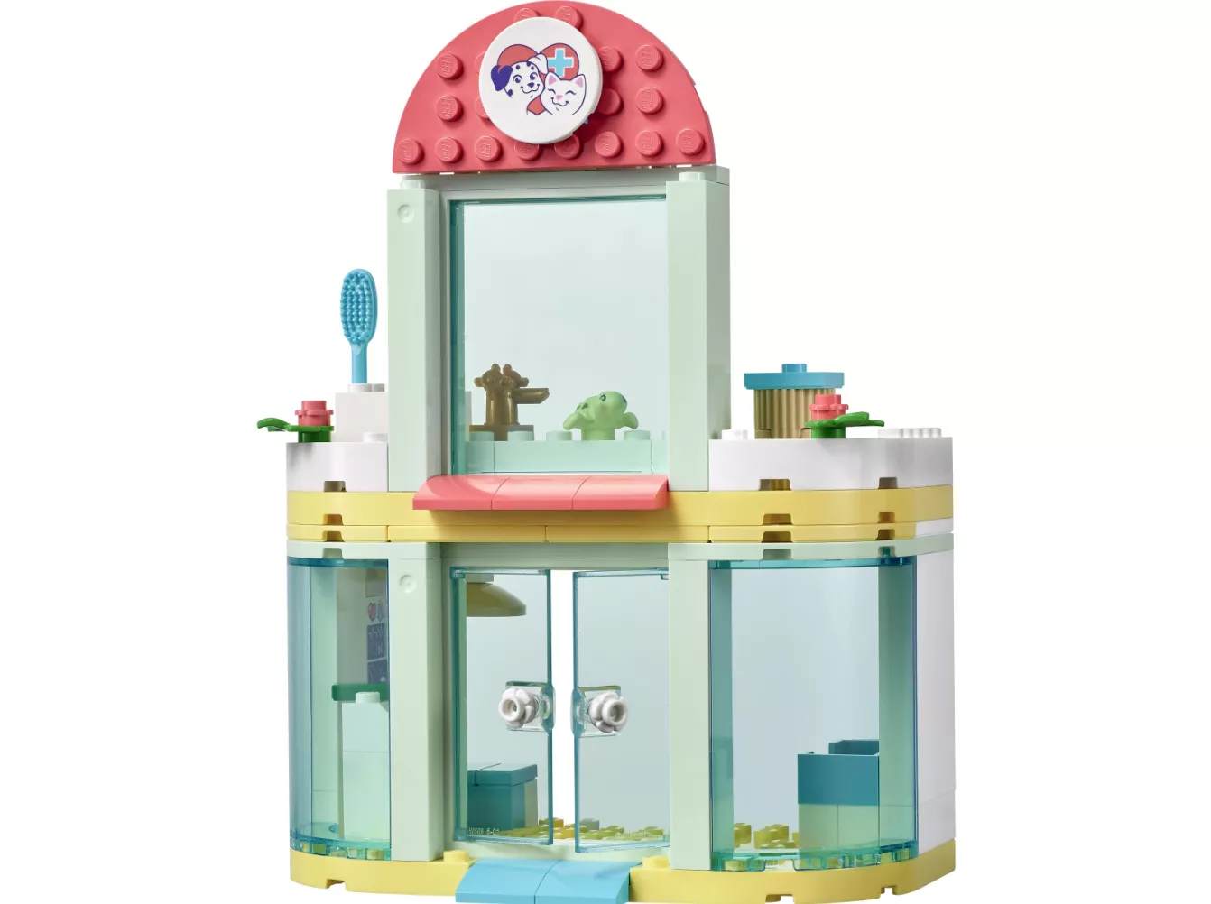 Конструктор LEGO Friends 41695 Клиника для домашних животных из серии «Друзья» (Хартлейк-Сити), выпущенный в 2022 году, содержит 111 деталей и 2 мини-фигурки. Предназначен для детей от 4 лет и включает в себя фигурки Мии, а также фигурки кошек, черепах и кроликов. Клиника оснащена игрушечным сканером, зоной для груминга и когтеточкой, а съемный верхний этаж обеспечивает доступ к деталям нижнего этажа, таким как кассовый аппарат и шкаф с инструментами. Пакеты с деталями набора организованы таким образом, чтобы в каждом находился персонаж или животное и небольшая модель.