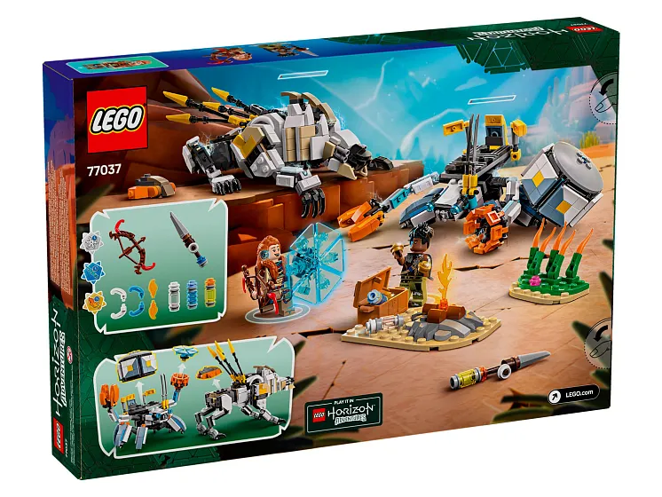 Набор LEGO 77037 «Элой и Варл против робота-стрелка и Пилозуба» — это набор серии Horizons из 768 деталей с 2 минифигурками, выпущенный в 2025 году. В него входят минифигурки Элой и Варла, а также собранные из кубиков роботы-стрелки и Пилозуб. Элой — главная героиня, опытная охотница на роботов, воспитанная изгнанником Ростом. Варл — член племени Нора и один из ближайших союзников Элой.