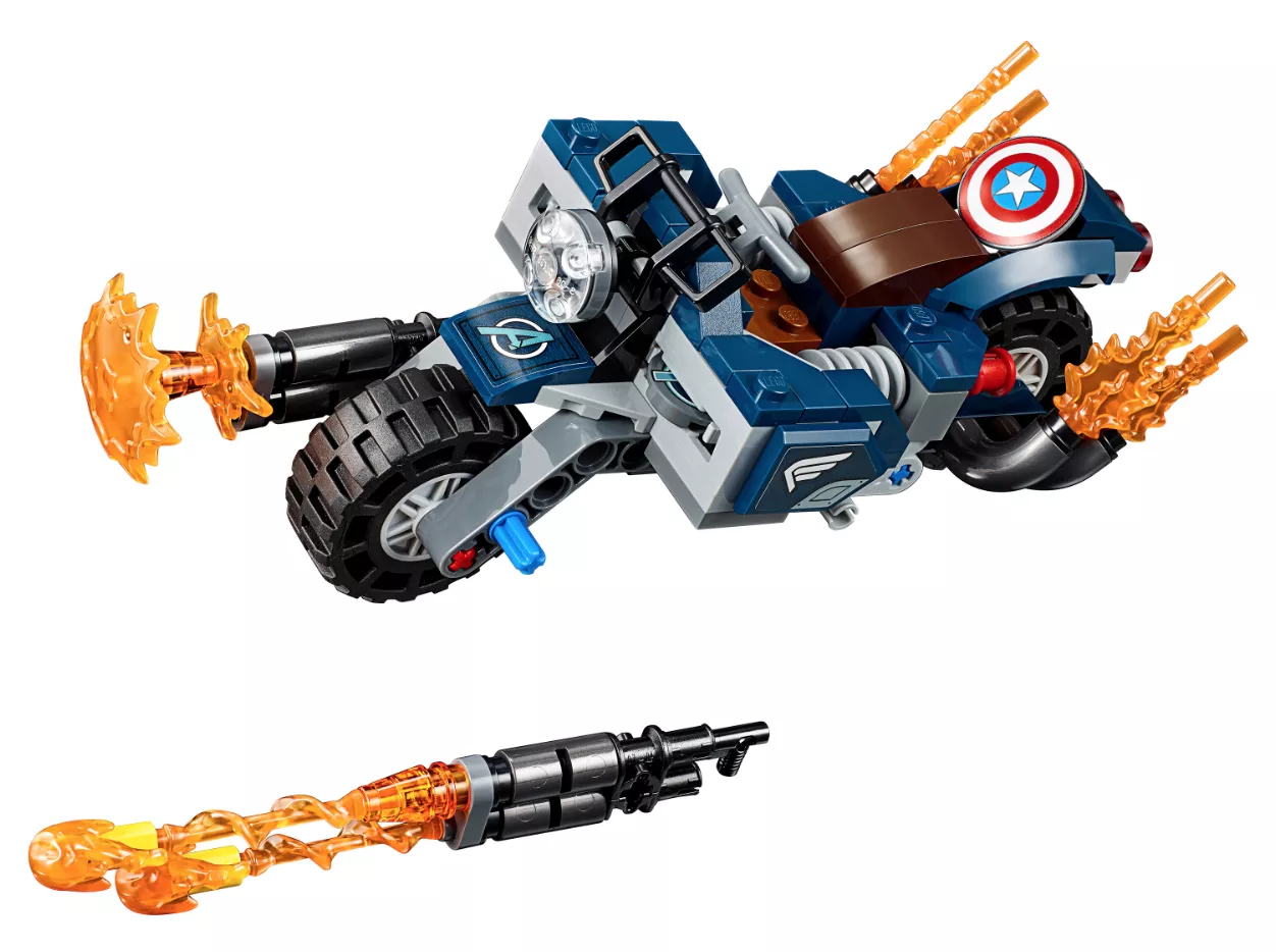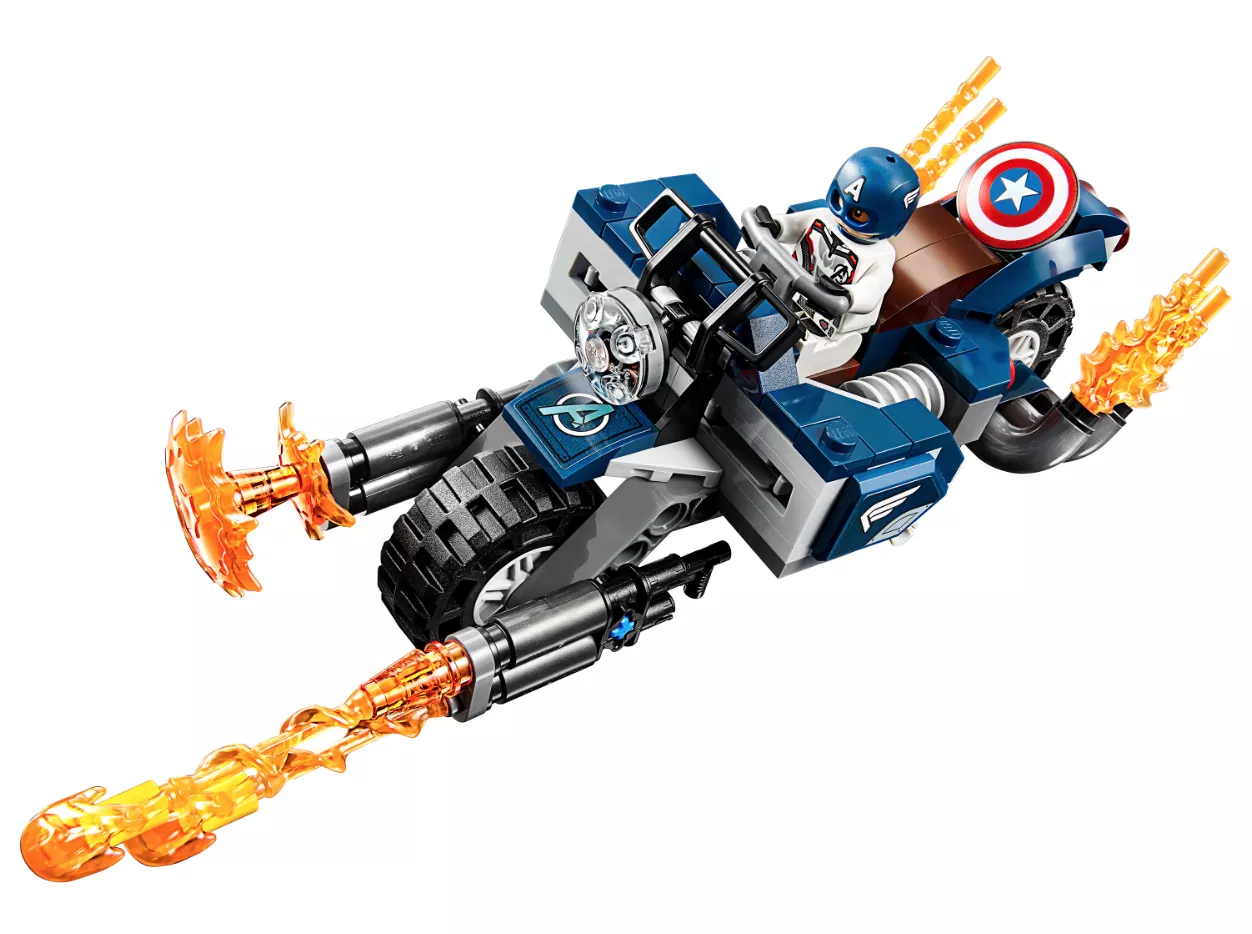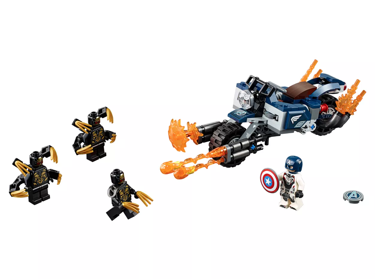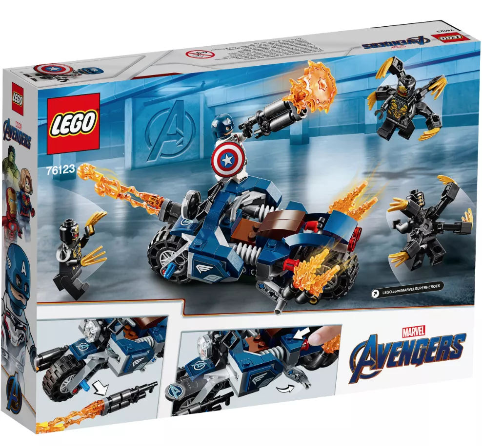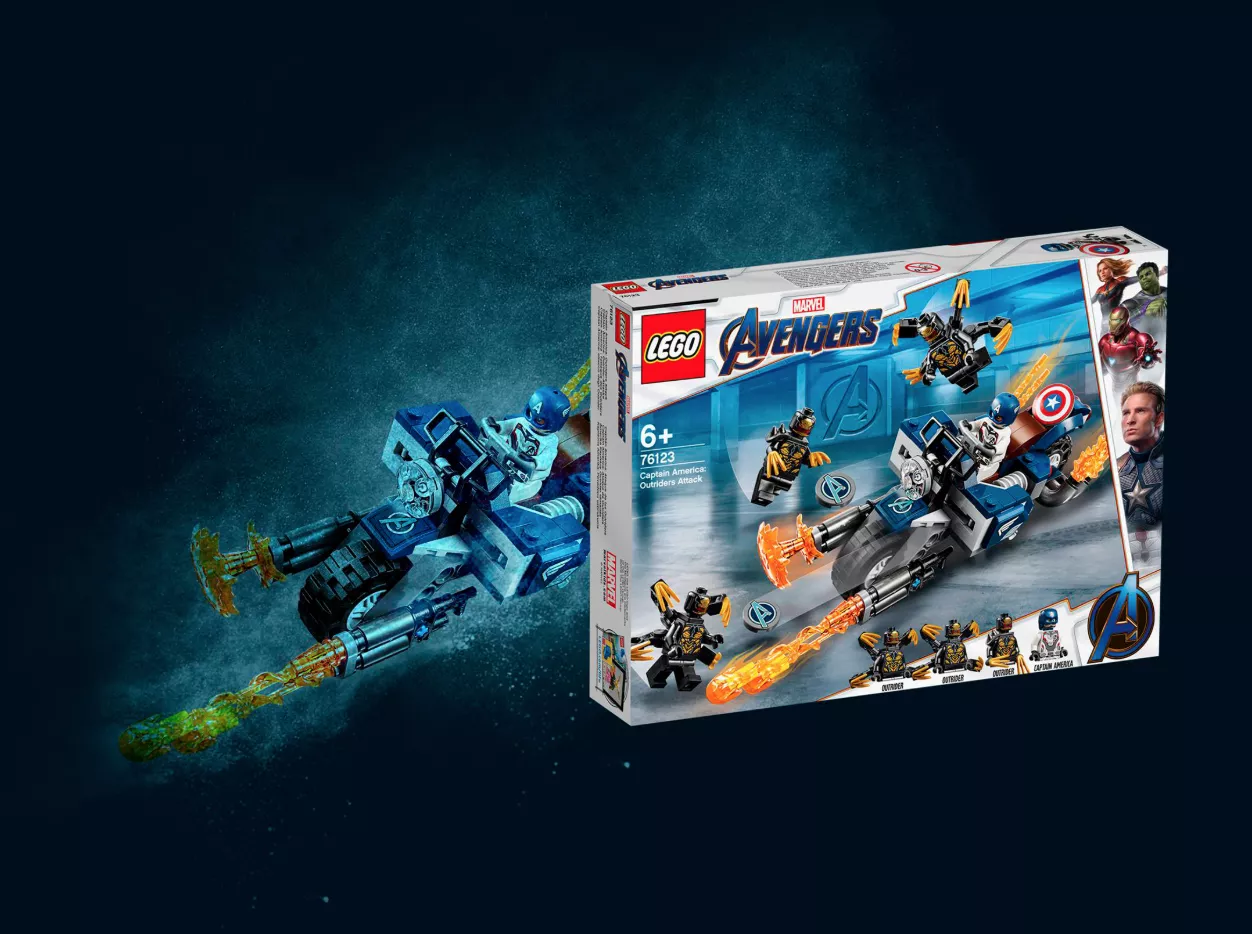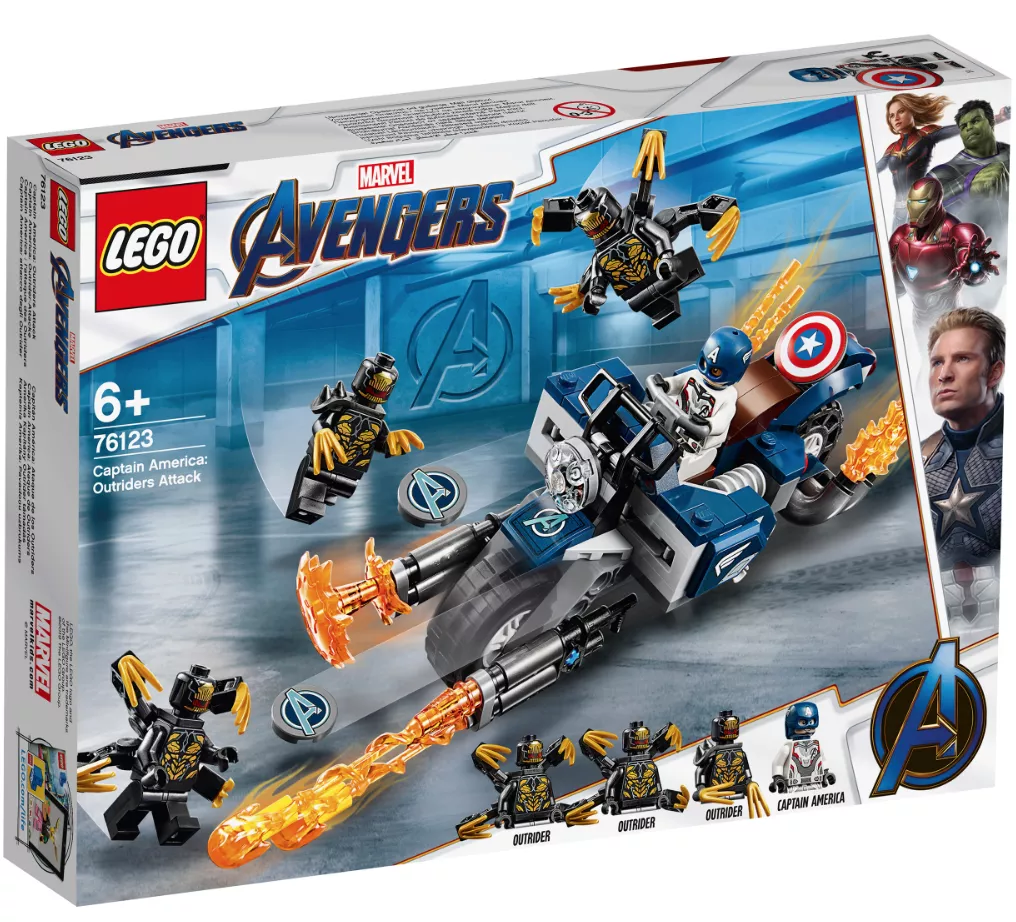 Набор LEGO 76123 «Капитан Америка: Атака Аутрайдеров» — это набор из 167 деталей, включающий 4 минифигурки супергероев Marvel, выпущенный в 2019 году. В комплект входят минифигурки: Капитан Америка в шлеме и три Аутрайдера. В наборе также есть мотоцикл с кабиной для минифигурки, два стреляющих щита, нестреляющие бластеры, точки крепления, складная подставка, элемент фары и пламя выхлопной трубы.