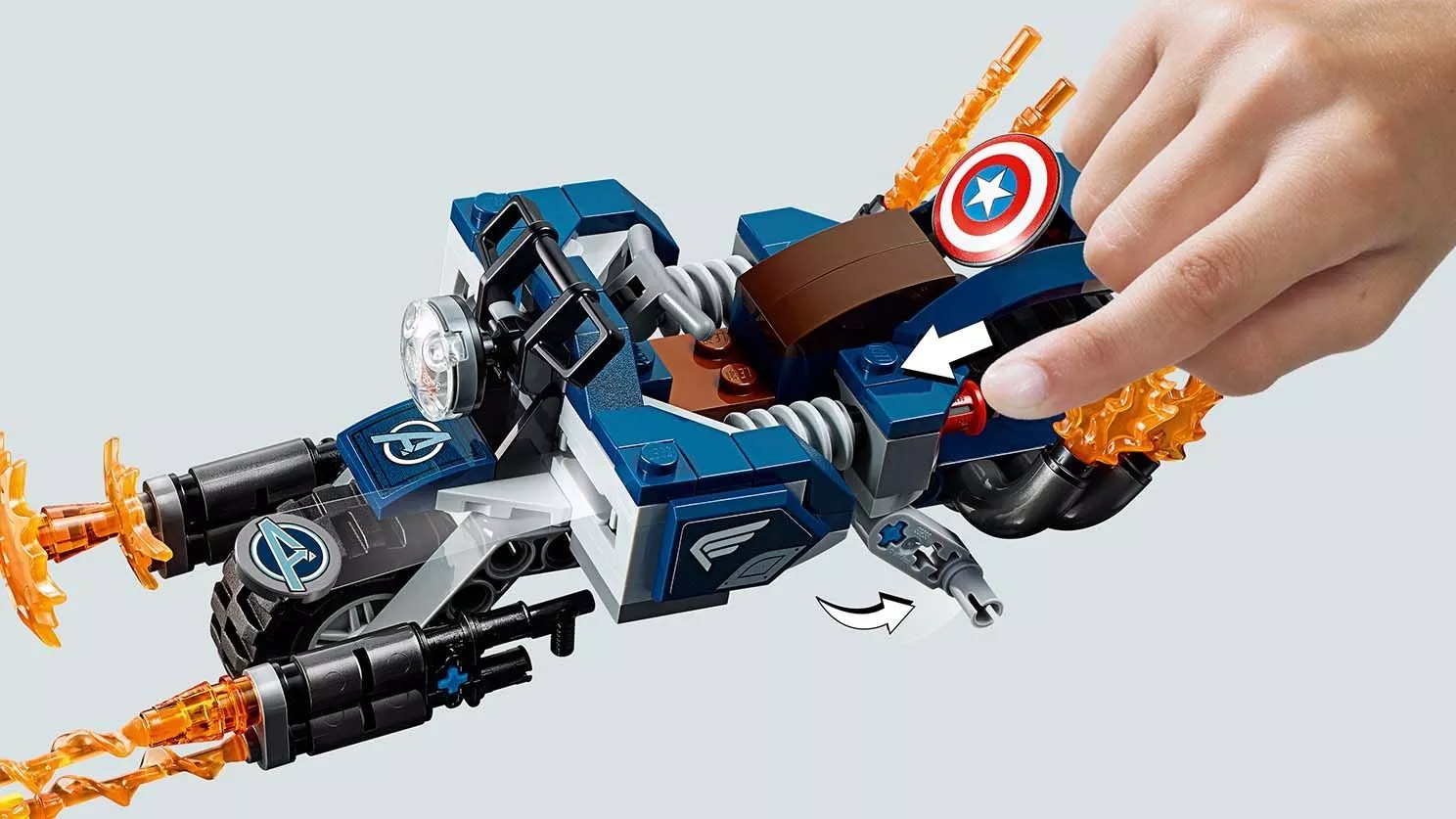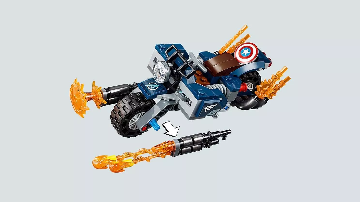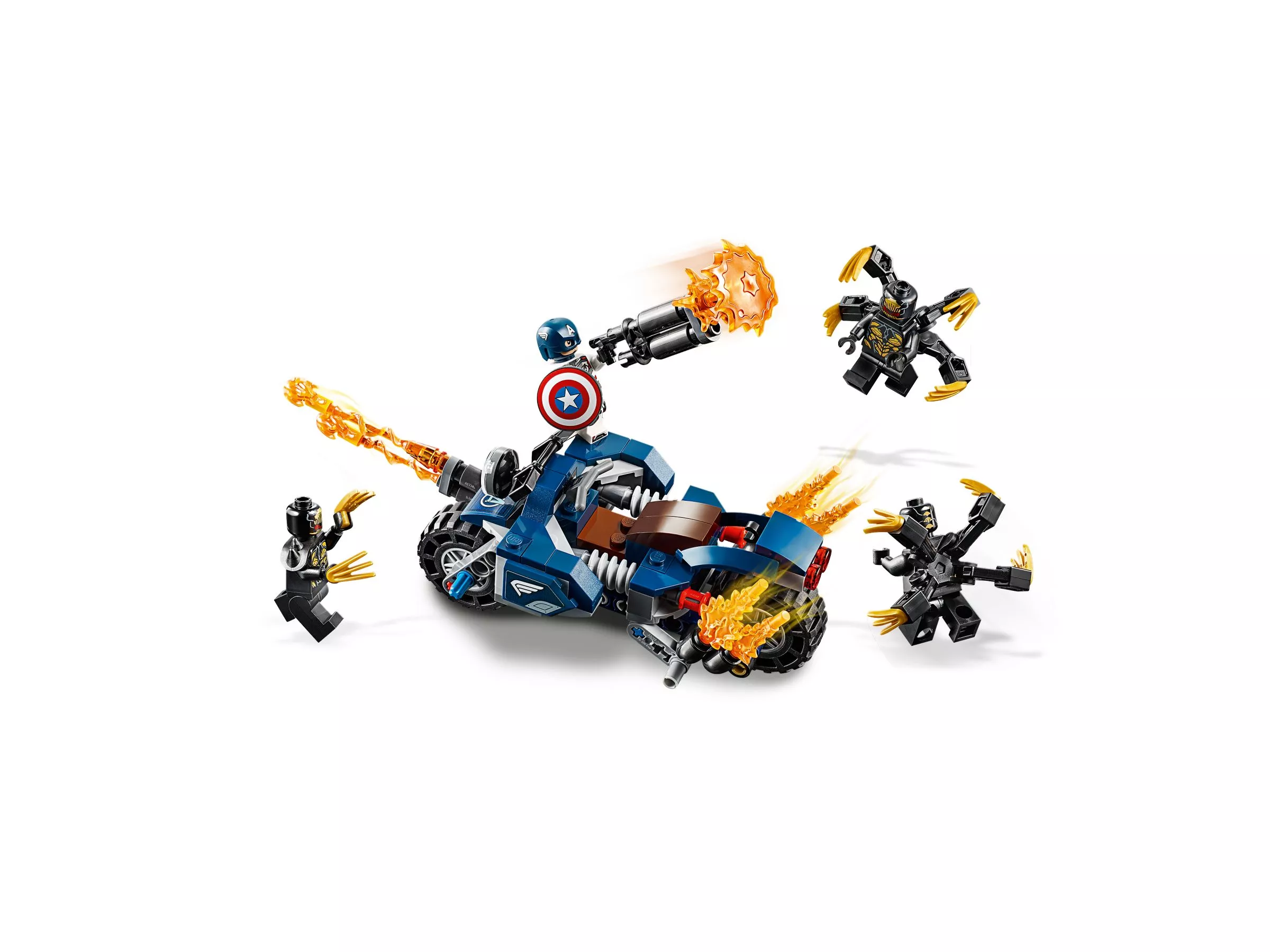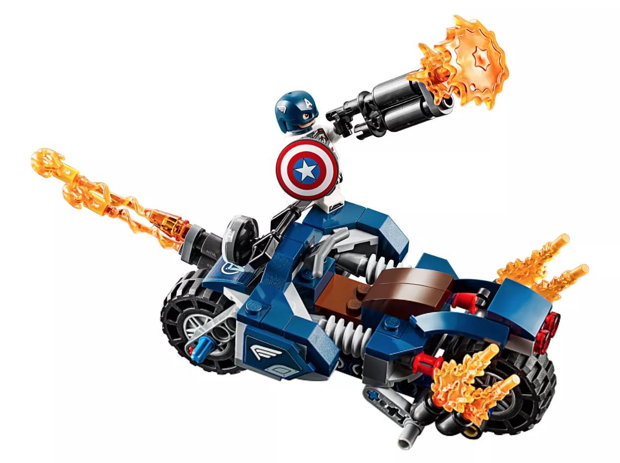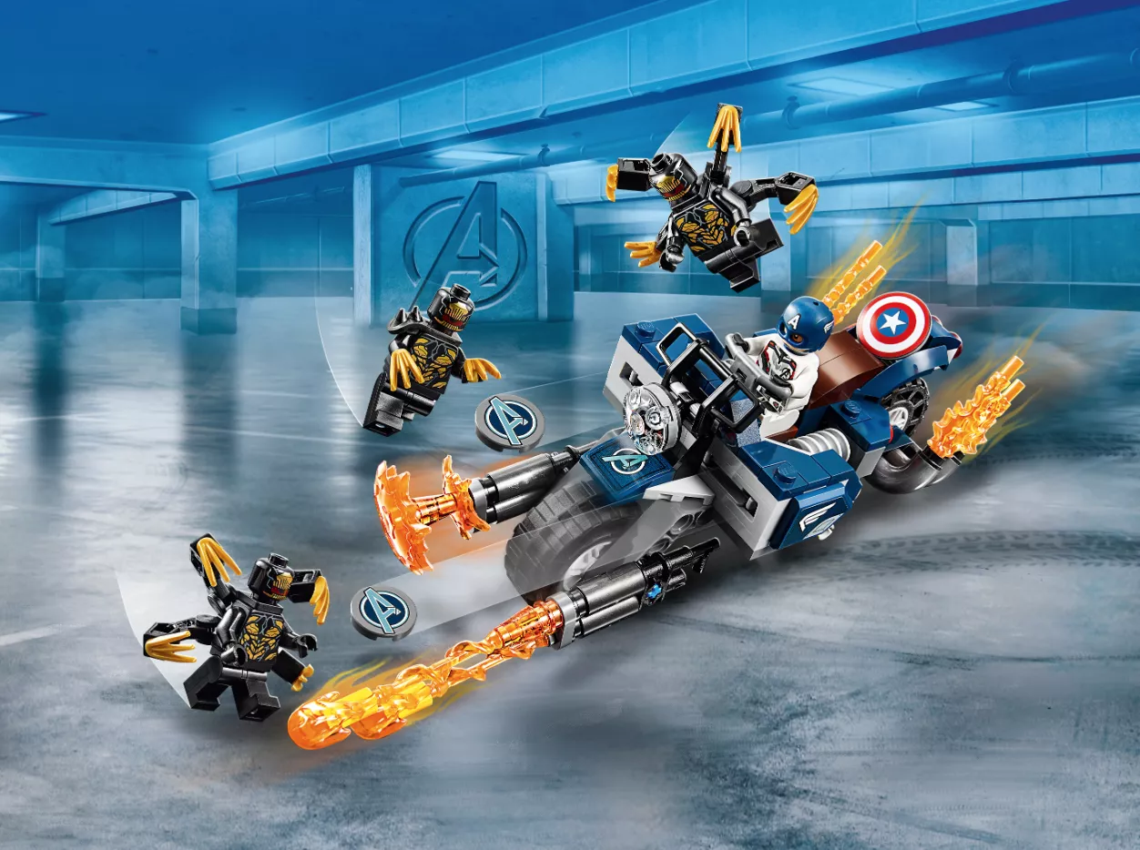 Набор LEGO 76123 «Капитан Америка: Атака Аутрайдеров» — это набор из 167 деталей, включающий 4 минифигурки супергероев Marvel, выпущенный в 2019 году. В комплект входят минифигурки: Капитан Америка в шлеме и три Аутрайдера. В наборе также есть мотоцикл с кабиной для минифигурки, два стреляющих щита, нестреляющие бластеры, точки крепления, складная подставка, элемент фары и пламя выхлопной трубы.