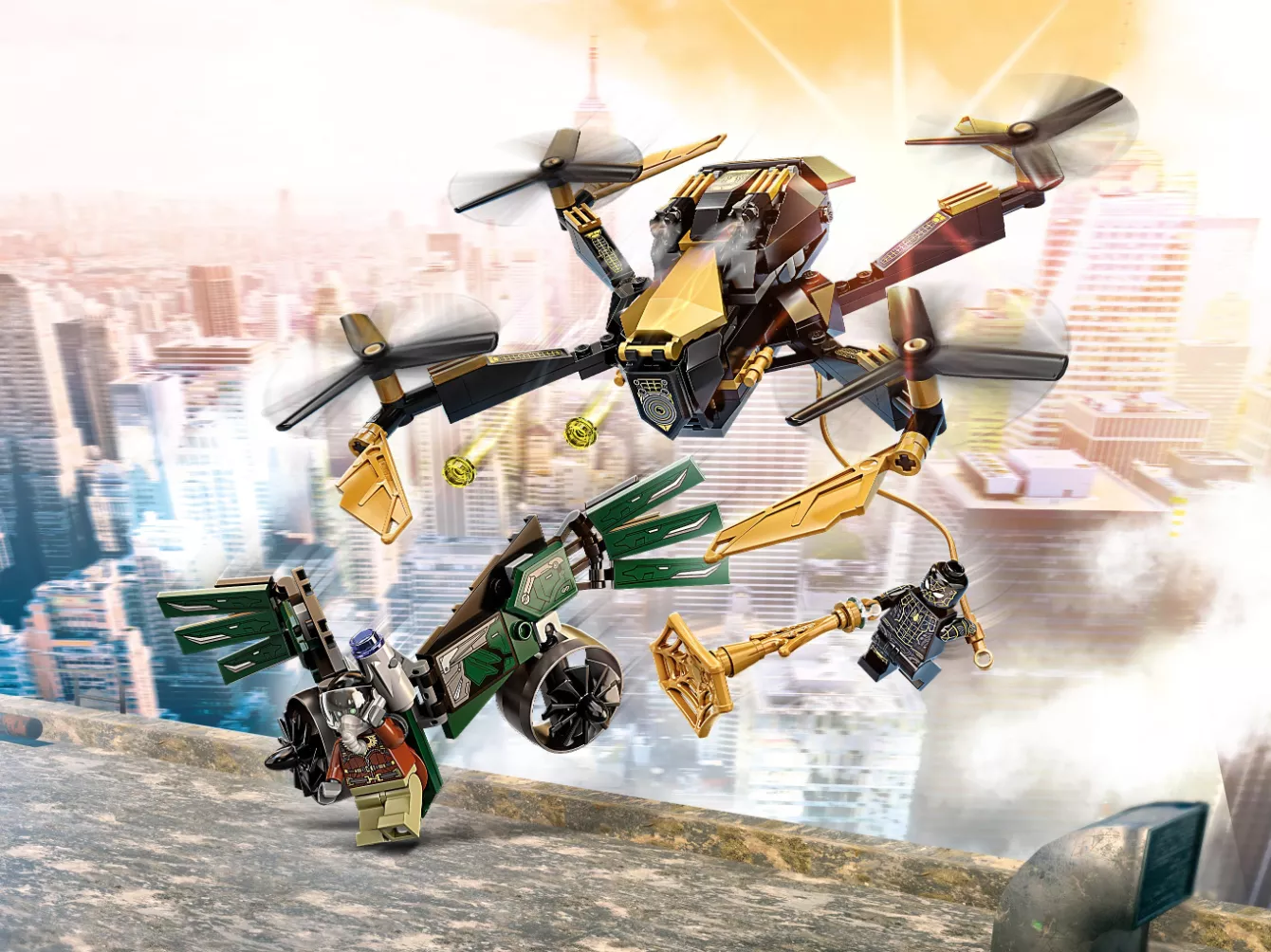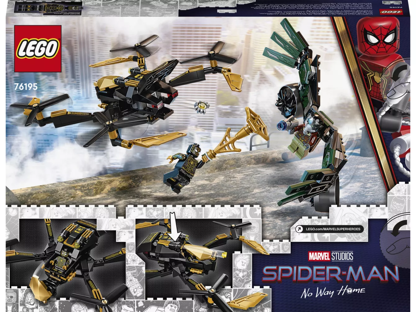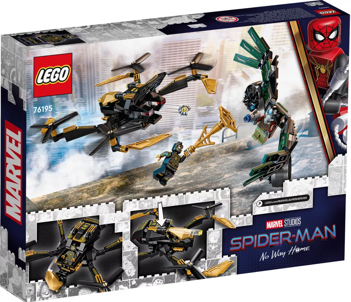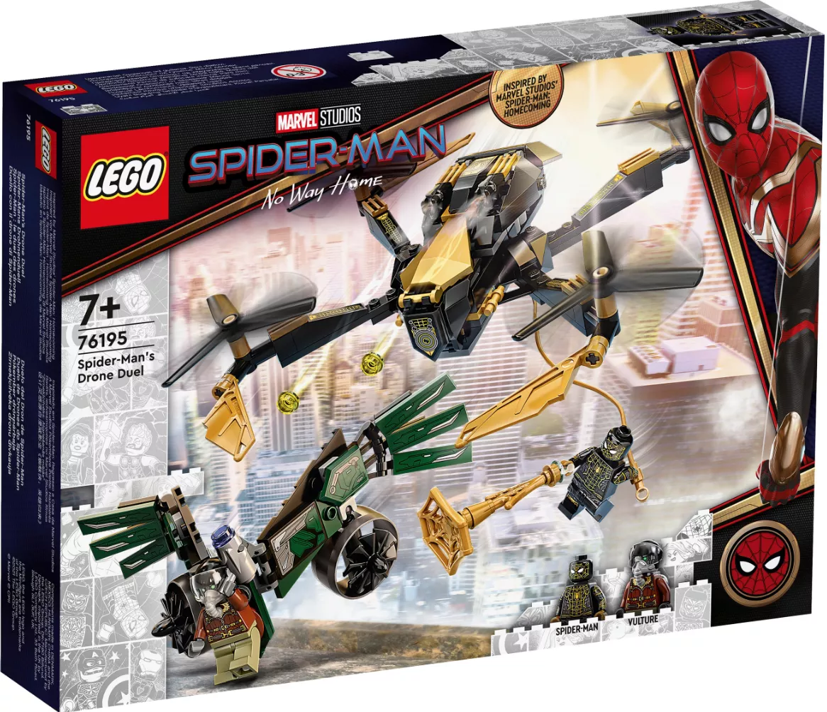 Набор LEGO 76195 «Дуэль дронов Человека-паука» — это набор из 198 деталей, посвященный супергероям Marvel, с двумя минифигурками, выпущенный в 2021 году. В него входят две минифигурки: Человек-паук и Стервятник. Набор состоит из сборного дрона с четырьмя роторами и двумя шипометами. Он создан по мотивам фильма «Человек-паук: Возвращение домой».