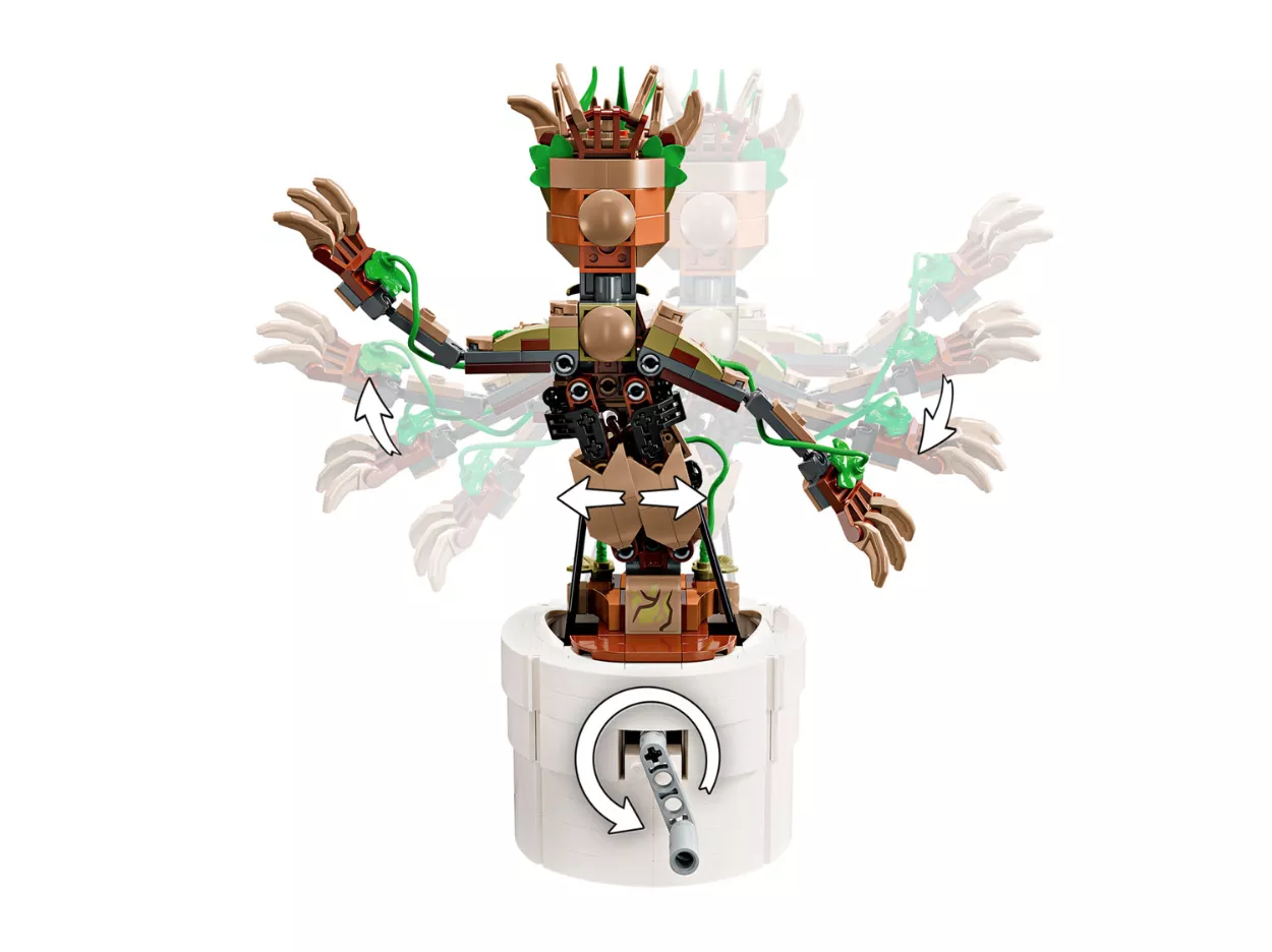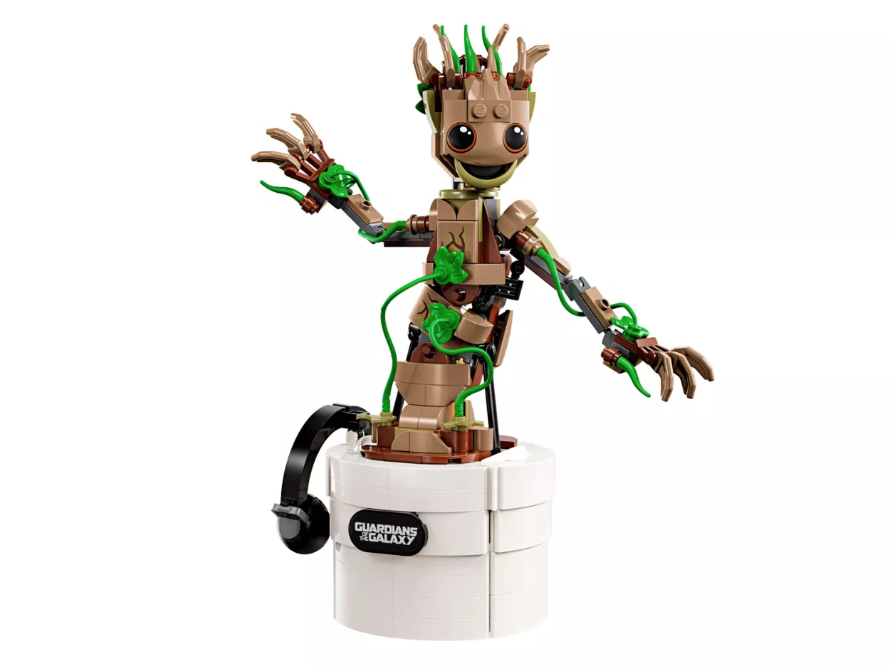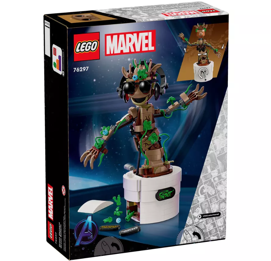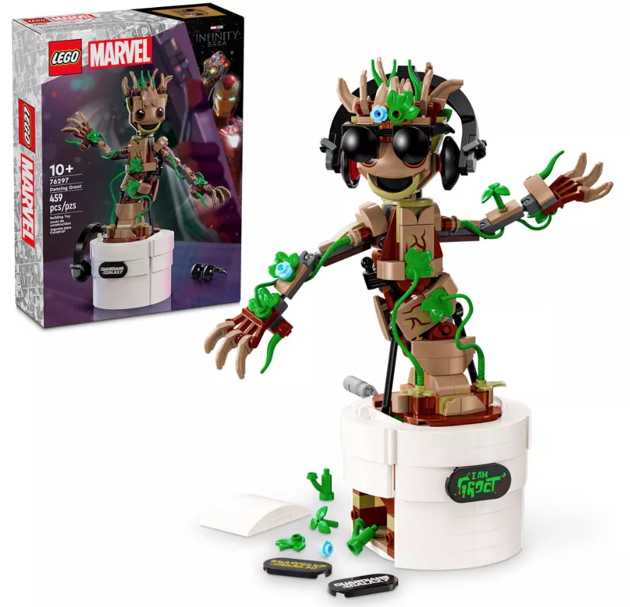 Набор LEGO 76297 «Танцующий Грут» — это набор из 459 деталей по мотивам серии Marvel Super Heroes, выпущенный в 2024 году. Он включает в себя сборную фигурку Грута с функцией танца, которую можно персонализировать с помощью сборных наушников, солнцезащитных очков и дополнительных листьев. В комплект также входит цветочный горшок с местом для хранения и три таблички с именем.