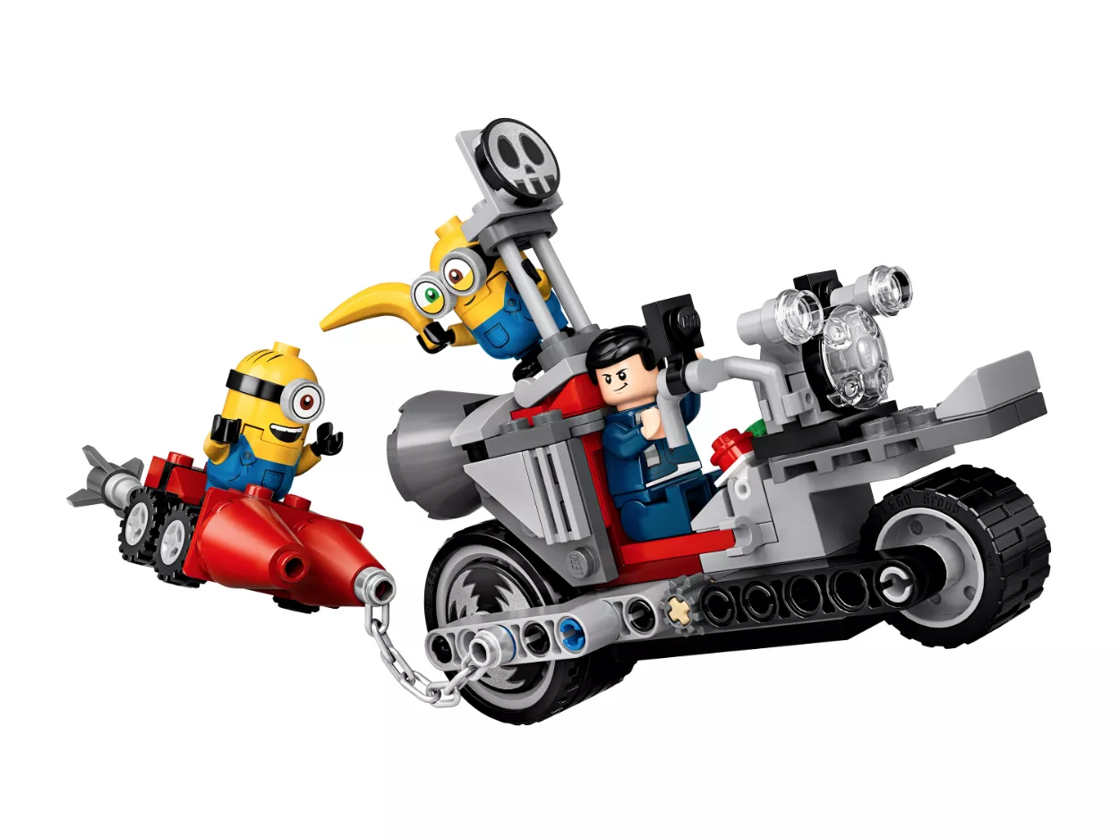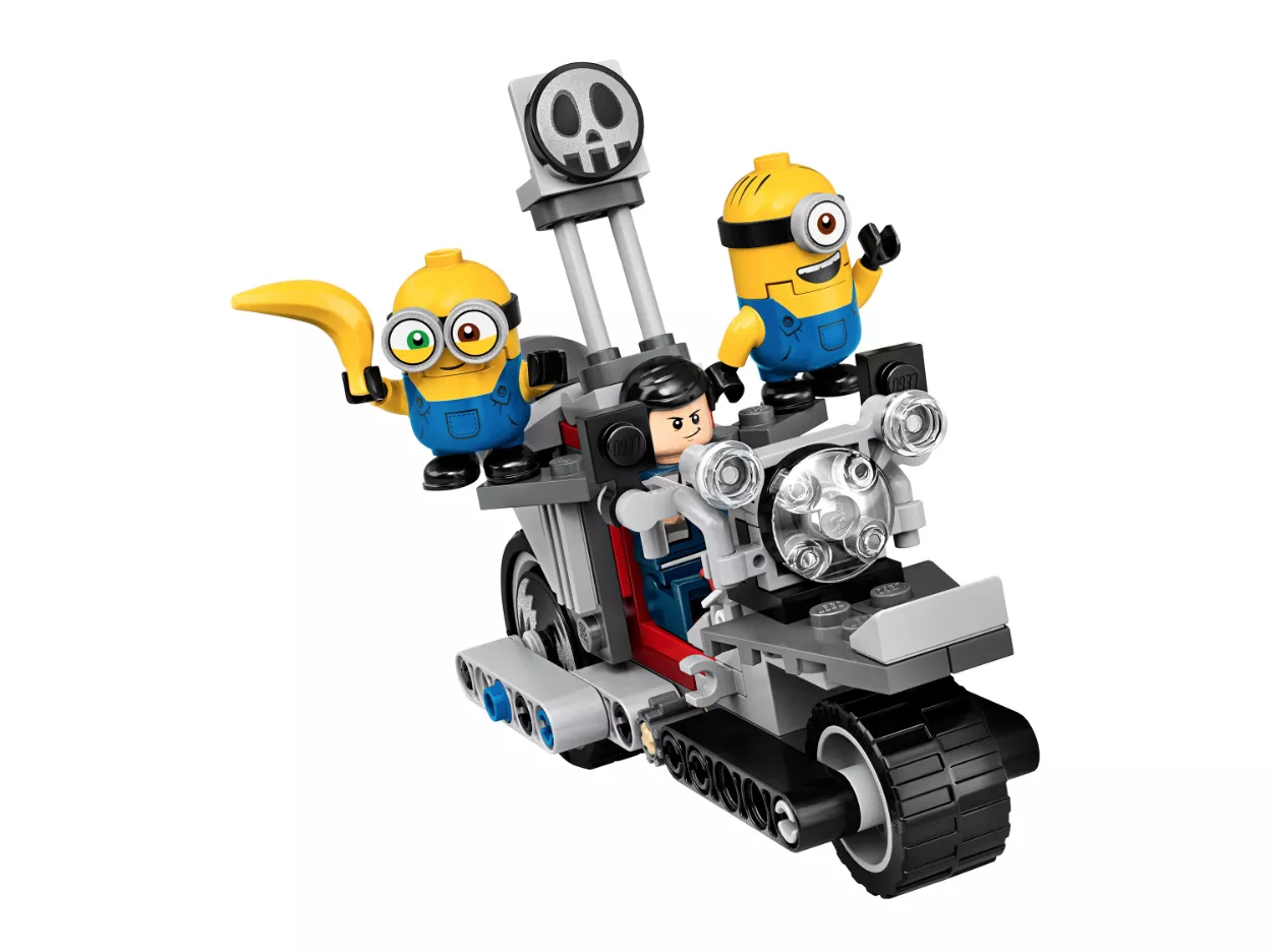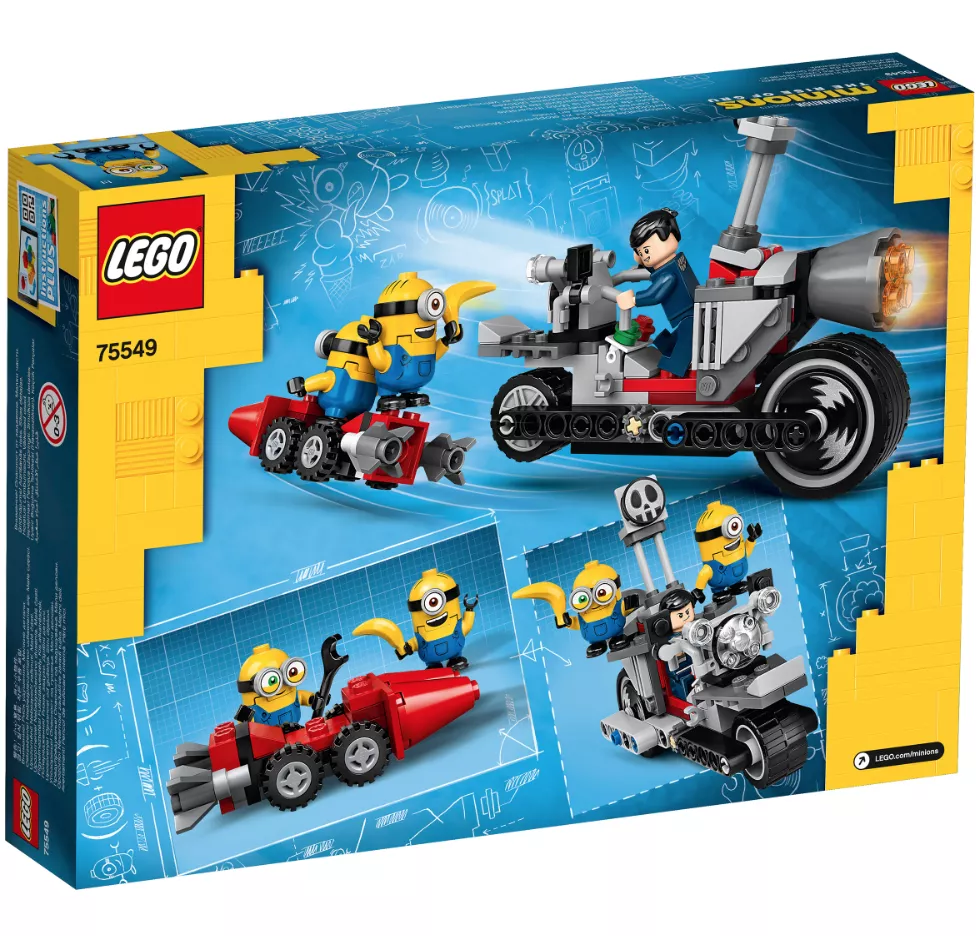 Набор LEGO 75549 «Неудержимая погоня на мотоцикле» — это набор из 136 деталей с 3 минифигурками, выпущенный в 2020 году. В него входит сборный мотоцикл и три фигурки: Гру, Боб и Стюарт. Миньоны могут ездить на мотоцикле или использовать прилагаемые реактивные коньки.
