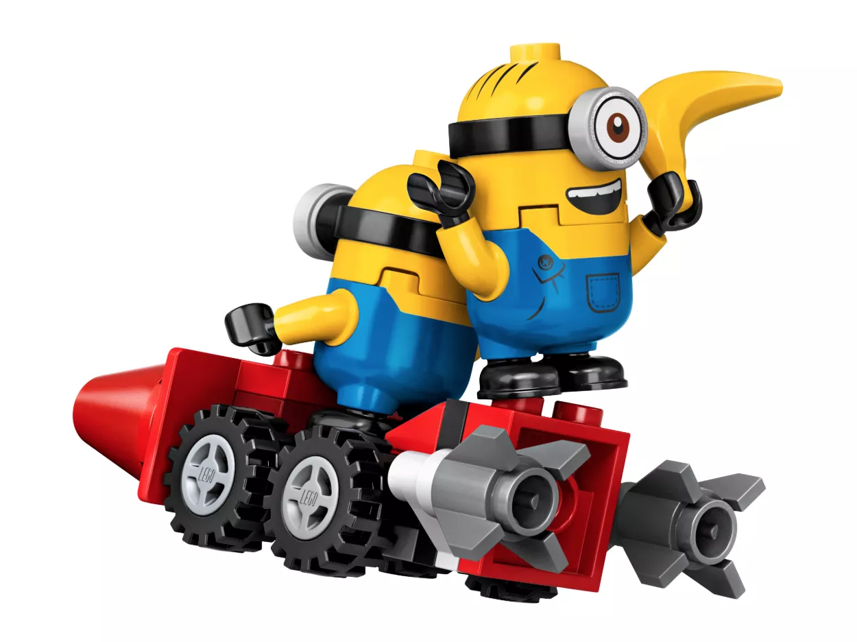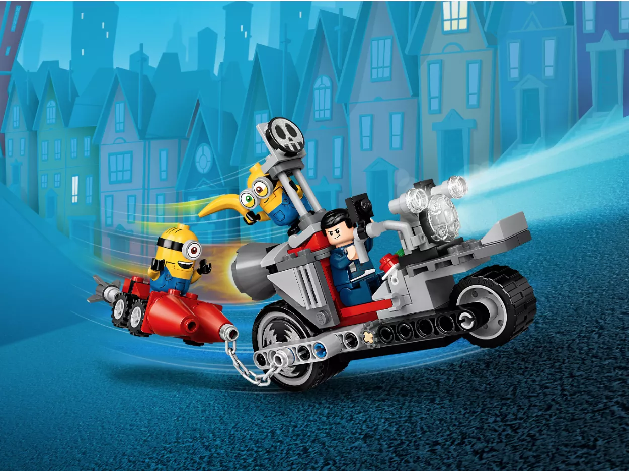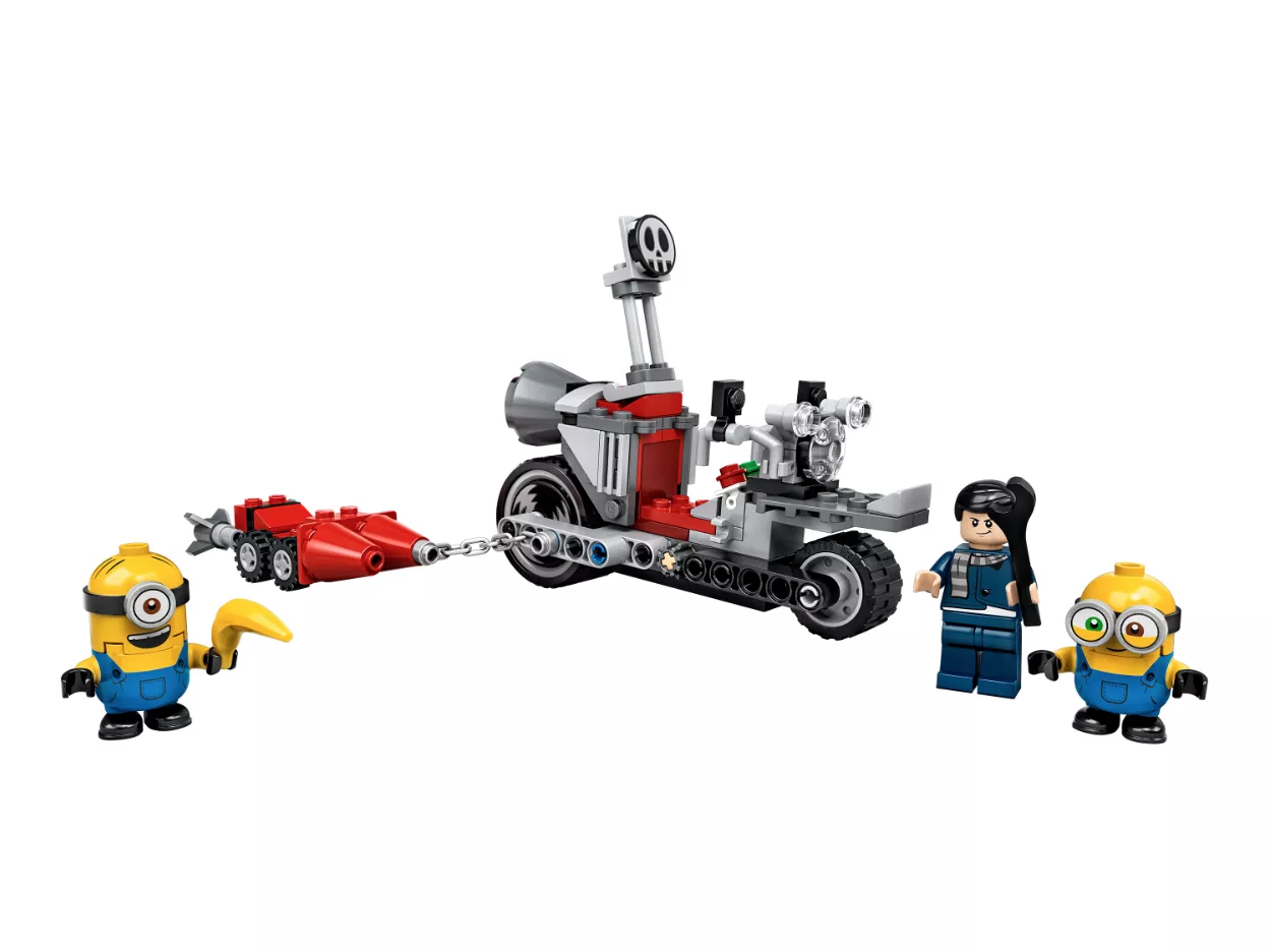 Набор LEGO 75549 «Неудержимая погоня на мотоцикле» — это набор из 136 деталей с 3 минифигурками, выпущенный в 2020 году. В него входит сборный мотоцикл и три фигурки: Гру, Боб и Стюарт. Миньоны могут ездить на мотоцикле или использовать прилагаемые реактивные коньки.