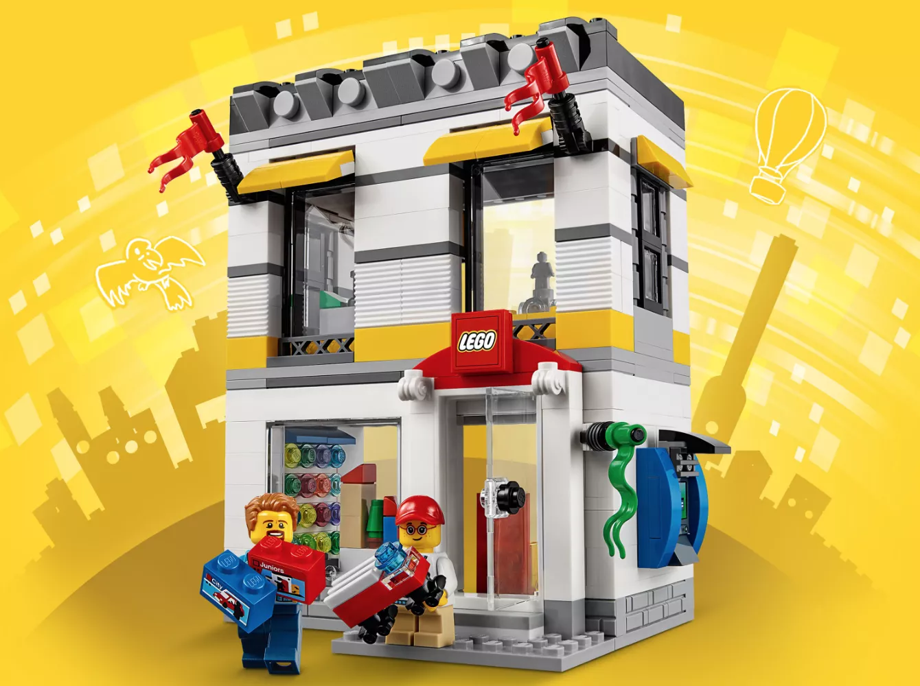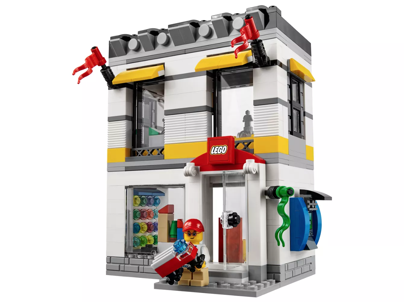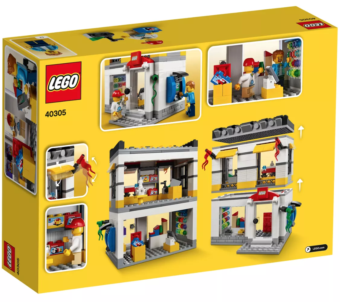Набор 40305 Microscale LEGO Brand Store — это эксклюзивный рекламный набор из 362 деталей с 2 минифигурками, выпущенный в 2018 году. Он включает в себя двухэтажный магазин с прозрачной открывающейся дверью, 3 окнами, 3 флагами, вывеской магазина LEGO, стеной для сборки, стендом для сборки мини-конструктора, полками с коробками LEGO, прилавком с кассовым аппаратом, 2 минифигурками и наклейками в стиле LEGO. Этот набор был доступен в LEGOLAND Billund, а также в LEGO Shop At Home.