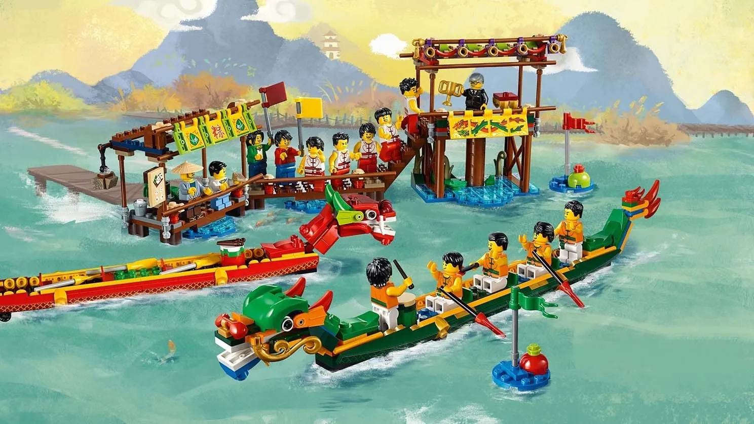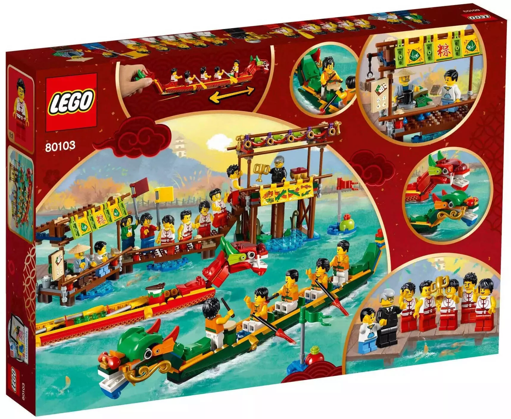 Набор LEGO 80103 «Гонка на лодках-драконах» — это сезонный набор из 643 деталей с 15 минифигурками, выпущенный в 2019 году. В него входят две лодки-дракона с открывающимися пастями и подвижными хвостами, пристань с киоском с едой, зона для зрителей, судейская трибуна, сборные финишные столбики, а также минифигурки с такими предметами, как весла и барабаны.