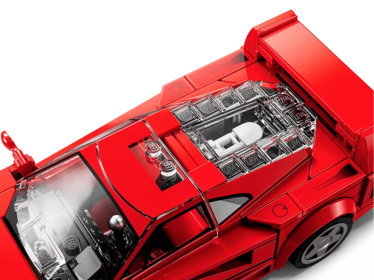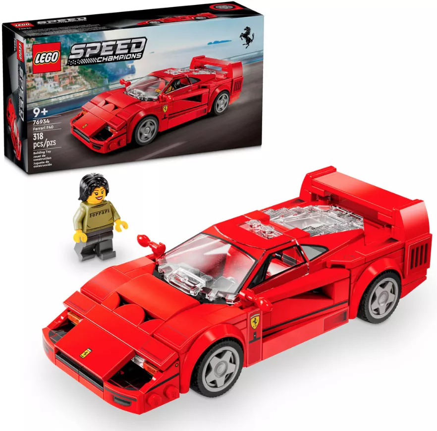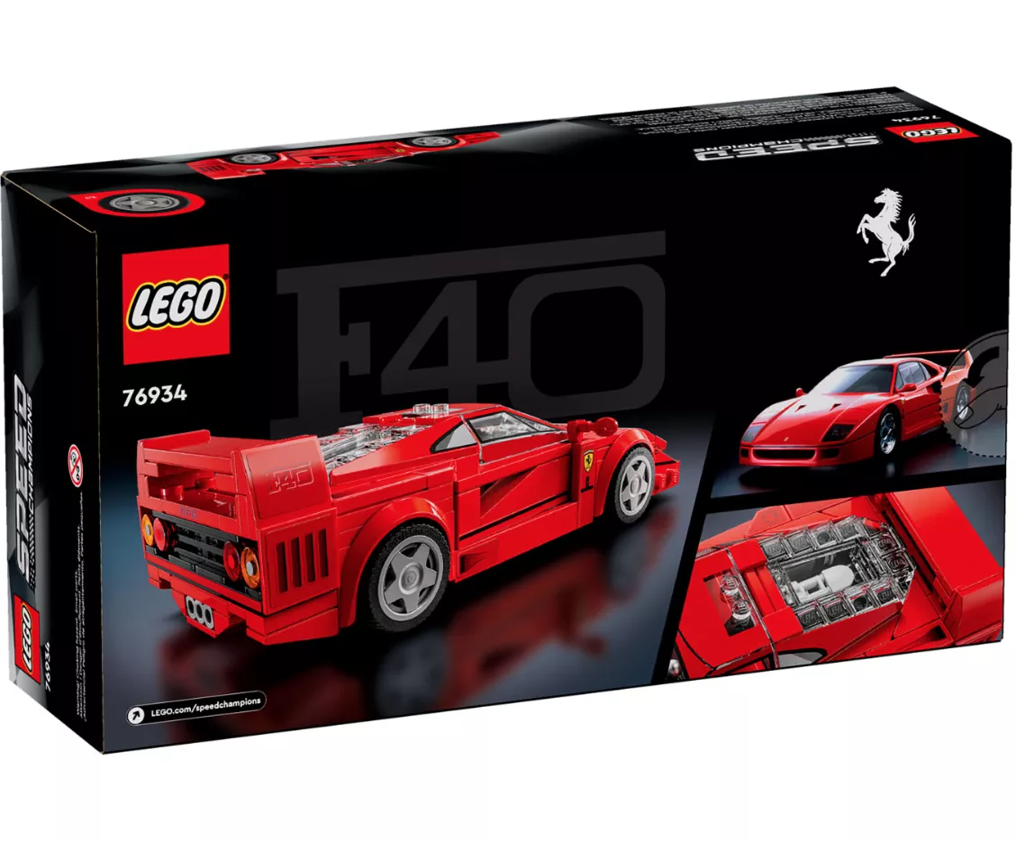 Набор LEGO 76934 Ferrari F40 Supercar из серии Speed Champions, выпущенный в 2024 году, содержит 318 деталей и 1 минифигурку. Модель подчеркивает ключевые особенности F40, включая задний спойлер, переднюю часть, выхлопные трубы, диски и боковые воздухозаборники. В комплект входит детализированный интерьер с красными сиденьями, приборной панелью, ручным тормозом, рычагом переключения передач и рулевым колесом, а также минифигурка водителя Ferrari, которая помещается в кабину.