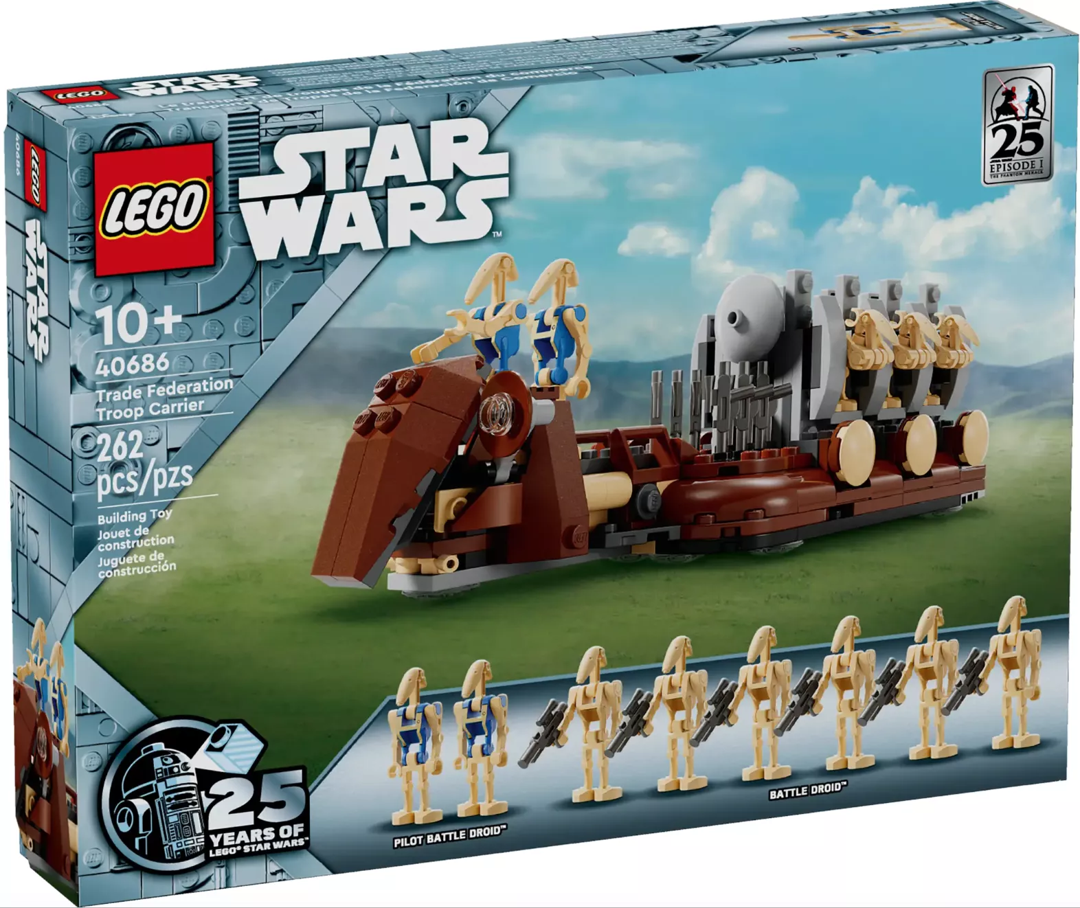 Набор LEGO 40686 «Транспортёр Торговой Федерации» — это рекламный набор Star Wars из 262 деталей с 8 минифигурками, выпущенный в 2024 году. Он является подарком за покупку в честь празднования LEGO 4 мая и включает в себя транспортёр Торговой Федерации с местом для 2 минифигурок боевых дроидов-пилотов, 6 боевых дроидов на задней стойке, бластеры, выдвижную и раскладывающуюся стойку, а также памятную деталь, посвящённую 25-летию серии.