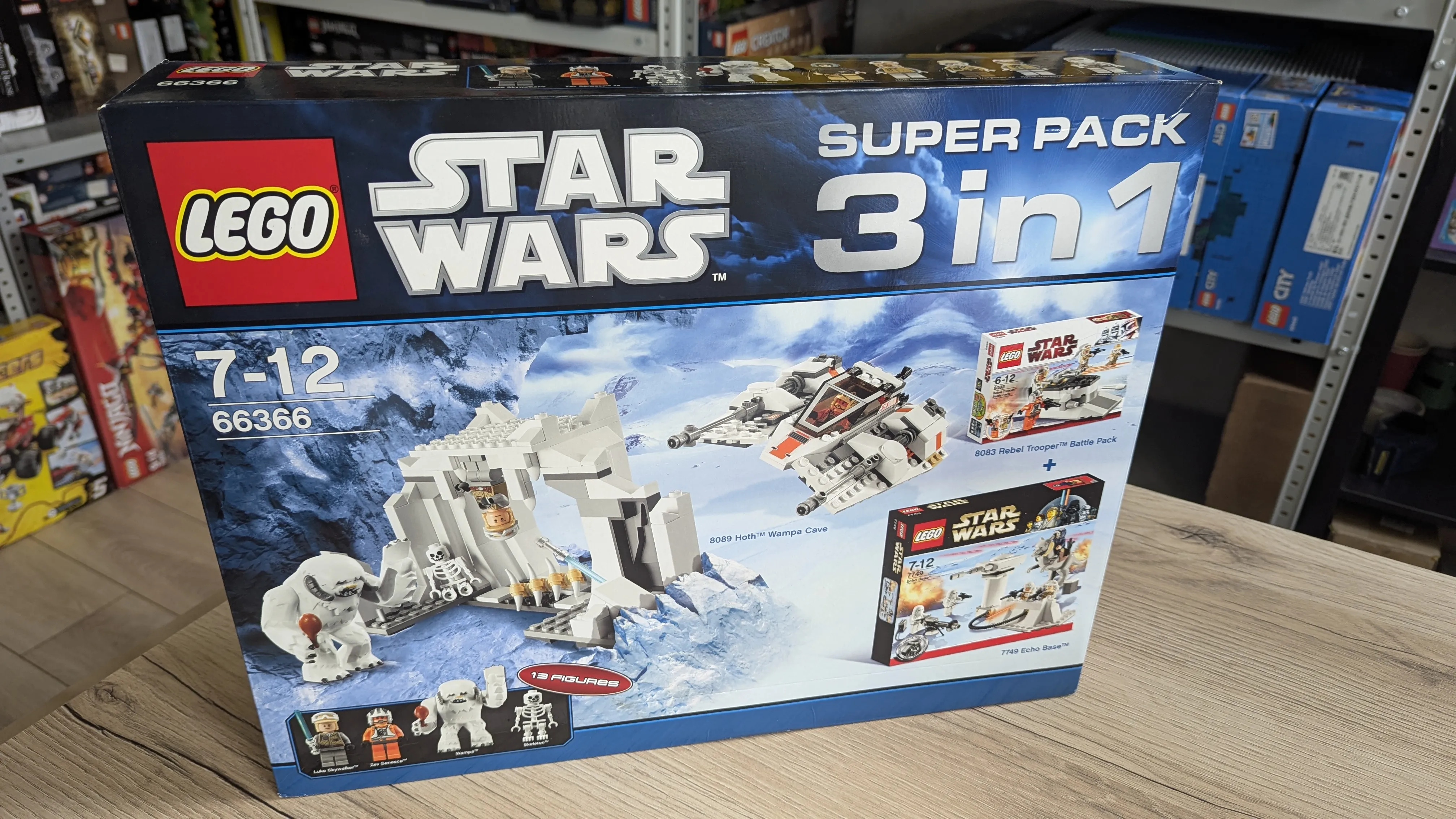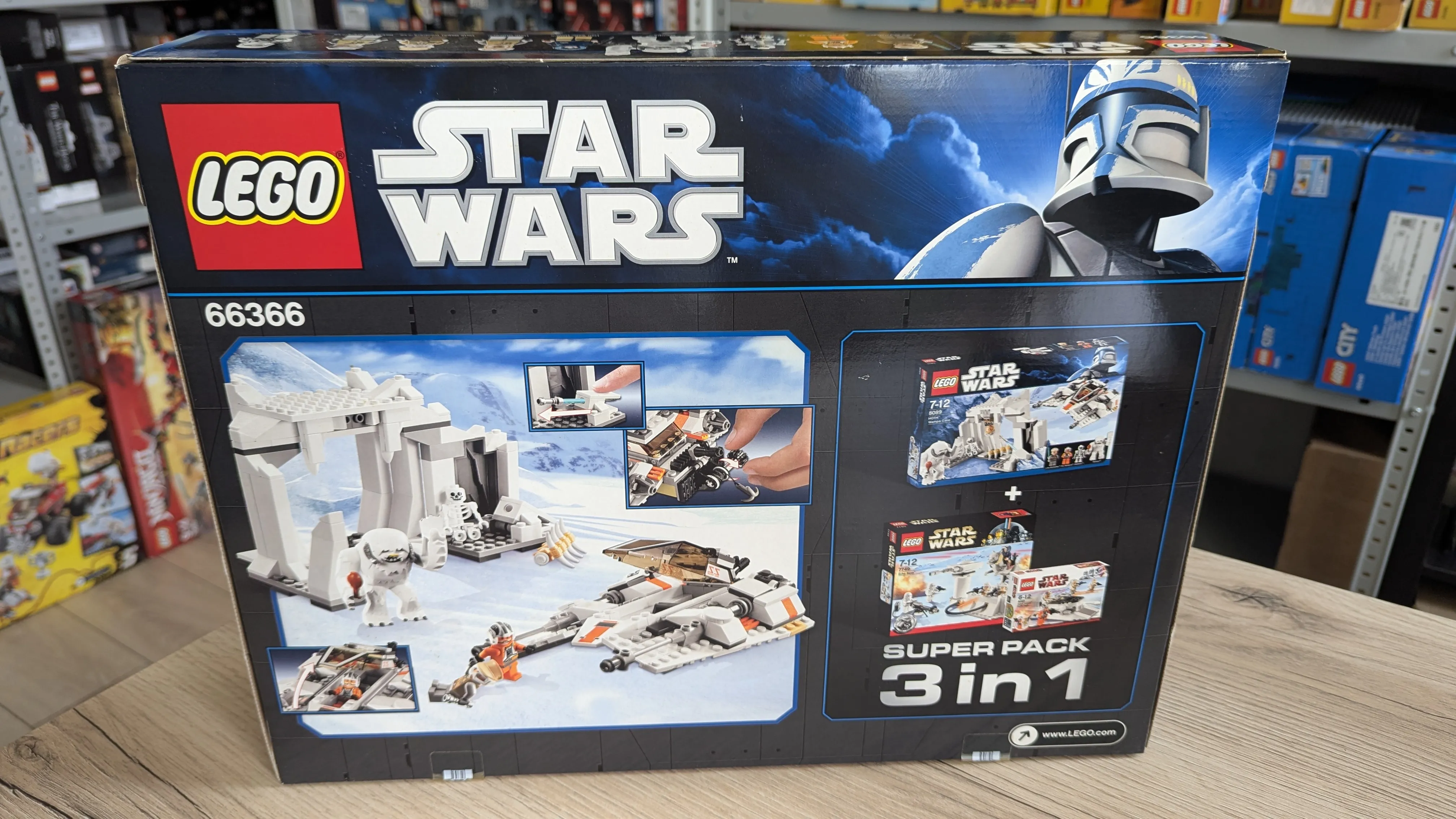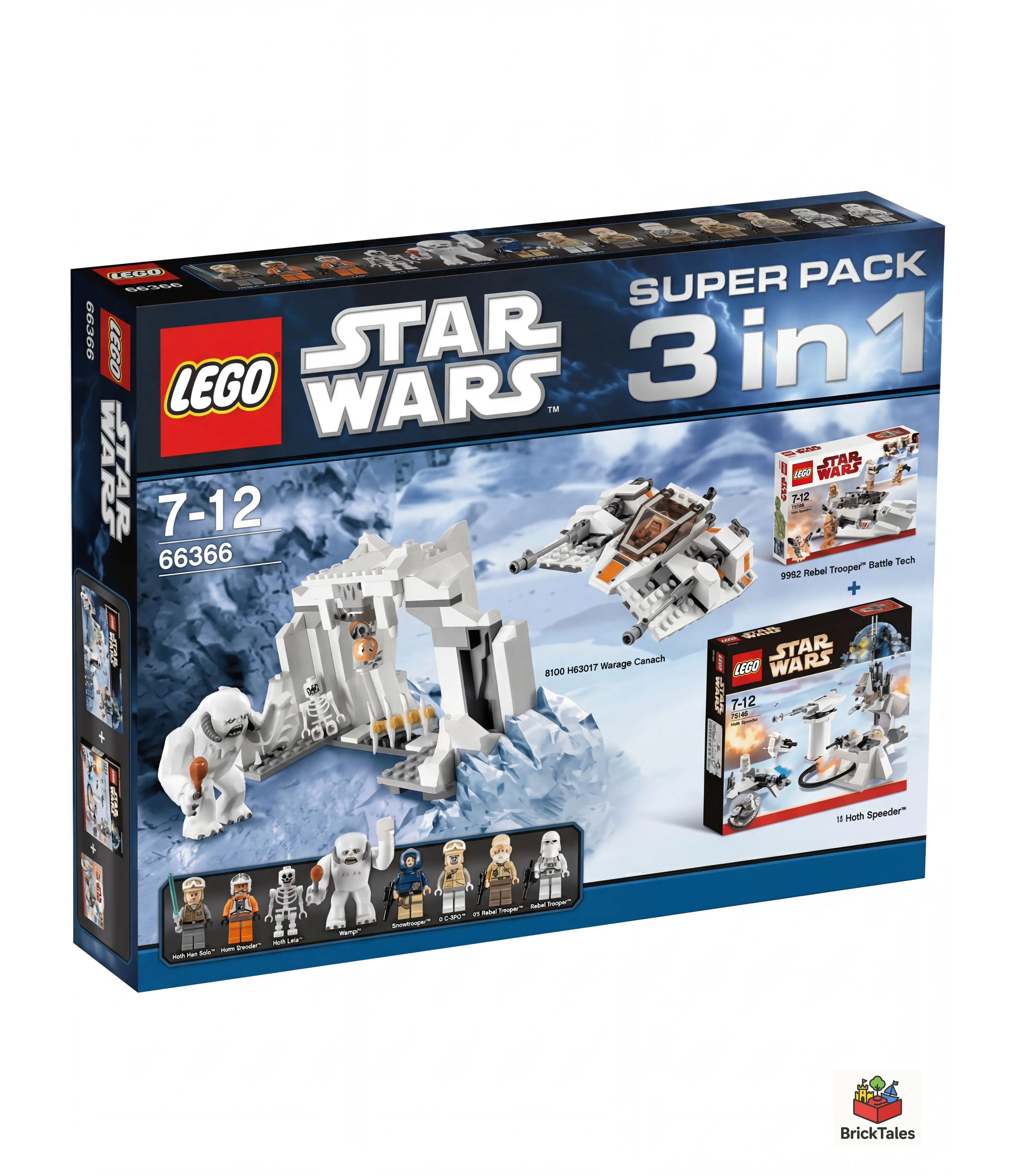 LEGO 66366-1 Star Wars Super Pack 3 in 1 — это набор Star Wars Value Packs, выпущенный в 2010 году и состоящий из 531 детали. В комплект входят наборы 7749 Echo Base, 8083 Rebel Trooper Battle Pack и 8089 Hoth Wampa Cave, все они посвящены сценам битвы на Хоте. В наборах представлены персонажи с Хота: Хан Соло, Люк Скайуокер, Зев Сенеска, несколько повстанцев и снежных штурмовиков с Хота, а также существо Вампа и скелет. Среди примечательных моделей — ворота и турель базы Эхо, снаряжение и спидер повстанцев, имперский спидербайк и снегоход со сценой в пещере Вампа.