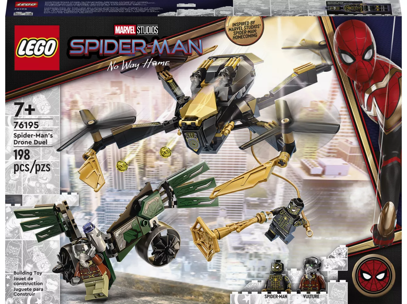Набор LEGO 76195 «Дуэль дронов Человека-паука» — это набор из 198 деталей, посвященный супергероям Marvel, с двумя минифигурками, выпущенный в 2021 году. В него входят две минифигурки: Человек-паук и Стервятник. Набор состоит из сборного дрона с четырьмя роторами и двумя шипометами. Он создан по мотивам фильма «Человек-паук: Возвращение домой».